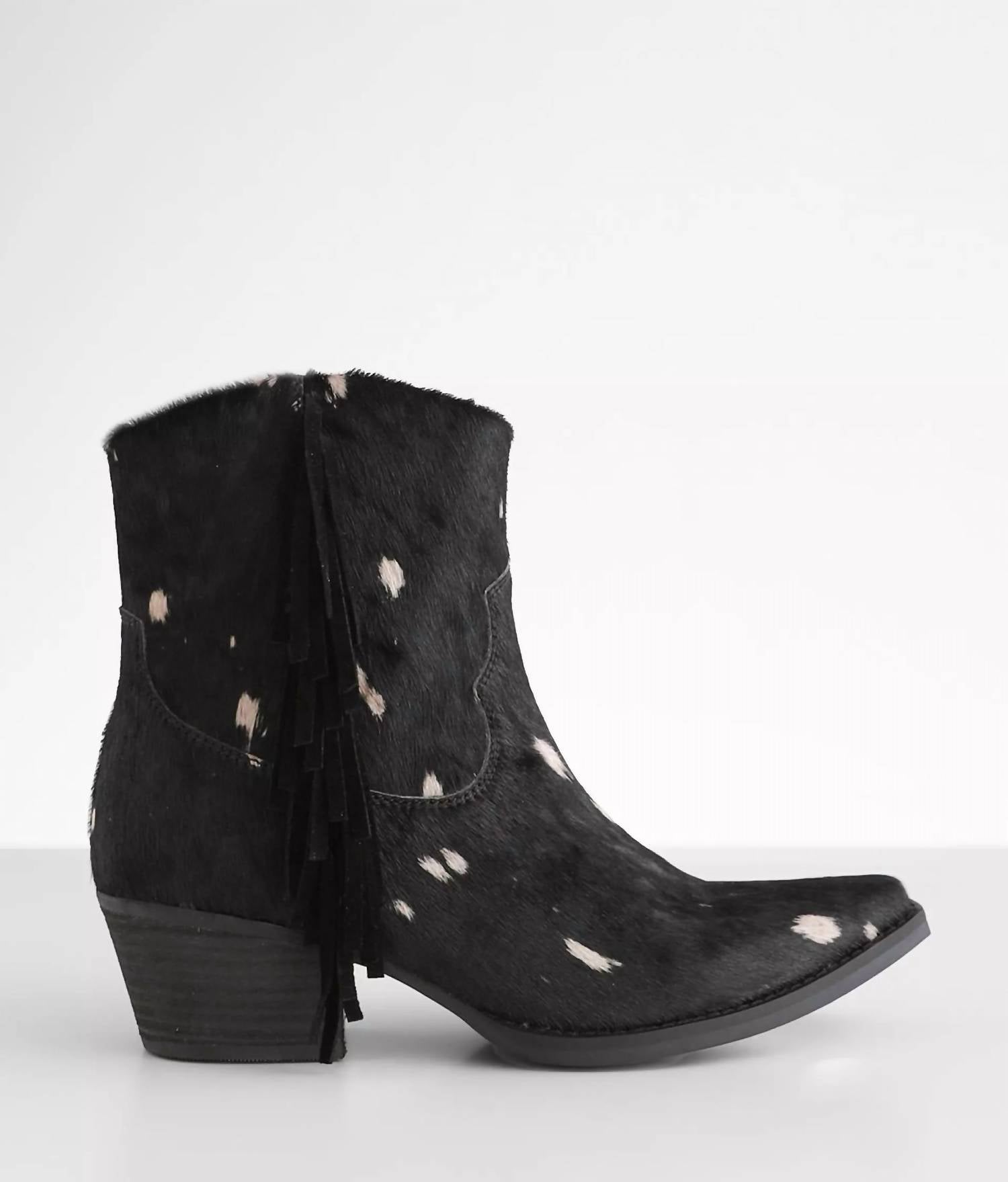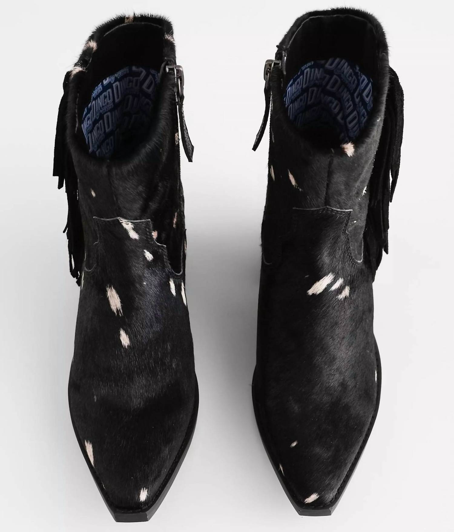 Step out with style in the Women's Hair We Go Western Boot by Dingo, featuring a striking pieced cowhide printed fur design in black. This bootie offers optimal comfort with its cushioned footbed and convenient side zip closure, while fringe details add a playful touch. With a 6.5" shaft and a pointed snip toe, it complements the low 2" block heel gracefully. Made with a leather upper and a balance of man-made materials, it is imported and requires wiping and occasional conditioning to maintain its pristine condition.