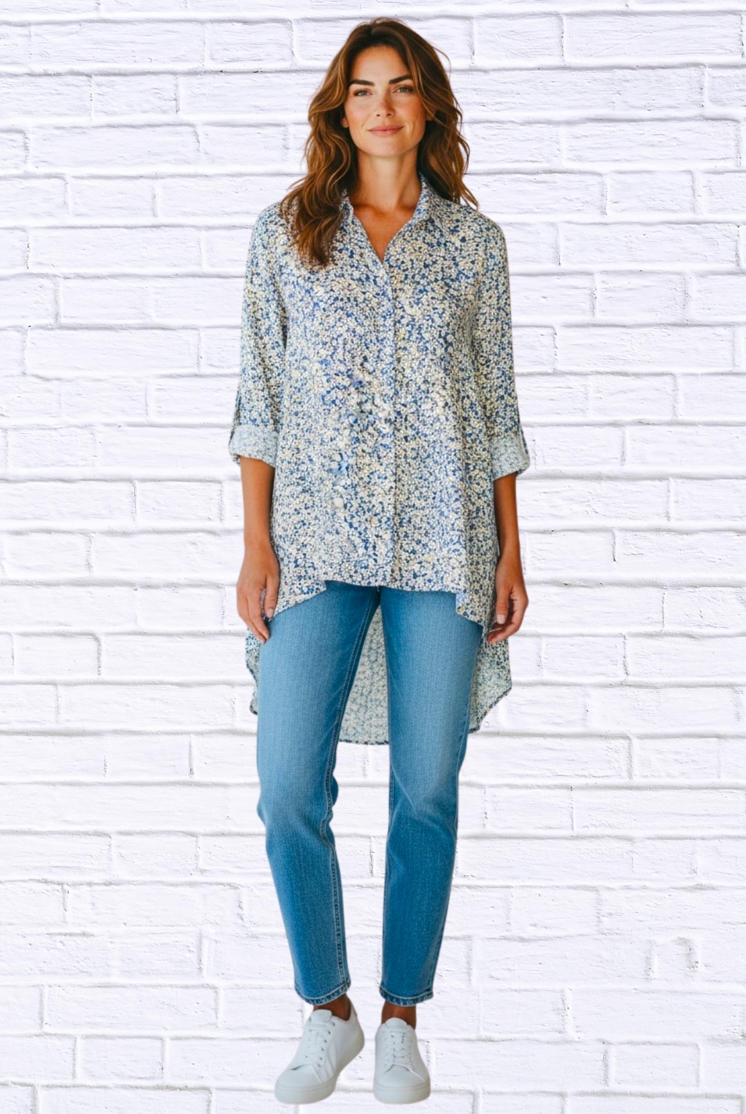 Pair this with your favorite jeans and slides for your next girls night out. Introducing the Floral Viscose High-low Shirt by Diva USA, a timeless piece in Dusty Lavender with White Flowers for a touch of feminine elegance. This long sleeve blouse is made from 100% viscose, offering a breathable and flowy fit with a collared neckline and high-low hemline. Button closure. Dry clean.