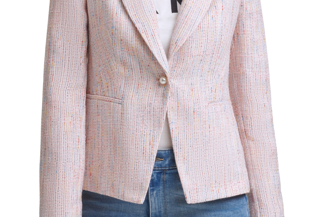 A single button embellished with a gorgeous imitation pearl accents the waistline of this DKNY blazer.| Approx. length; 22-1/2| Notched collar; front imitation pearl button closure| Two pockets at hips| Long sleeves with shoulder pads| Lined