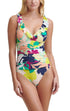 Ask a question about DKNY Women's Printed Removable Cups Lined Deep V Neck Ruffled Underwire One Piece Swimsuit Blue Size 16