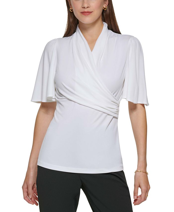 Fluttery sleeves lend endless beauty to this stylish DKNY top| a V-neck pick with a ruched design at the side.| Approx. 24-1/2 long| V-neck| Ruched detail at side| Flutter sleeves
