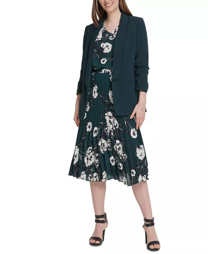 Approx. length; 27|Shawl collar; open front|Shoulder pads|Ruched 3/4-sleeves|Lined