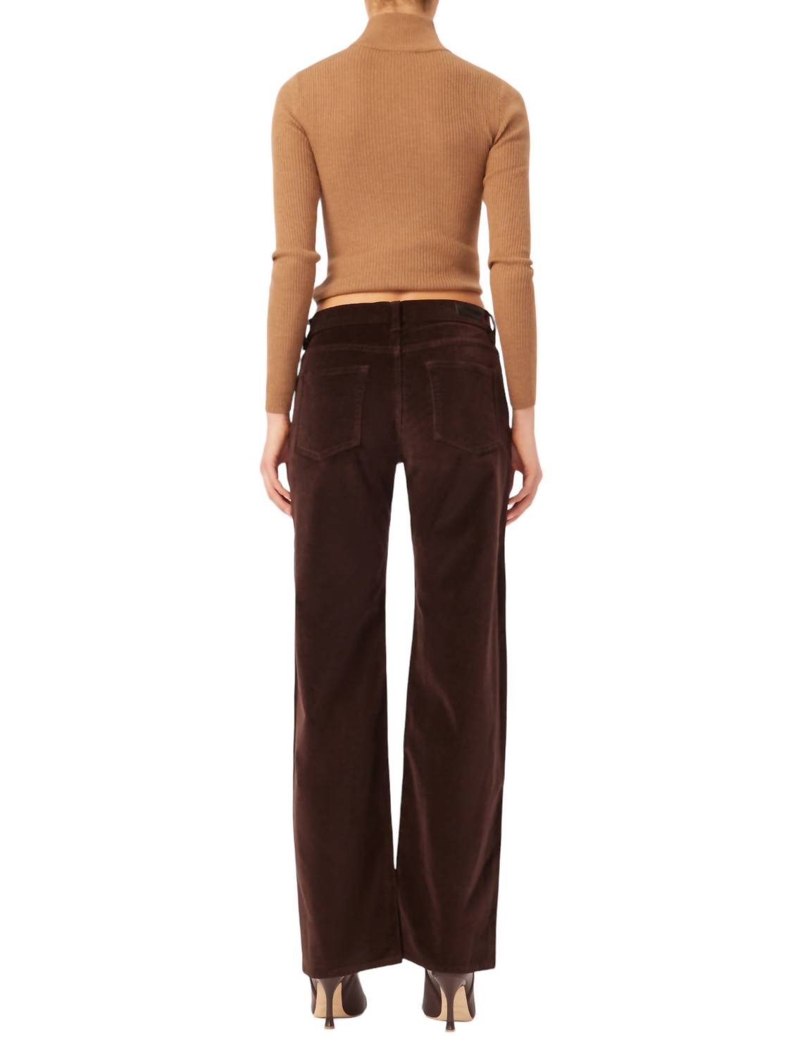 This classic straight leg jean has a perfect fit and goes with just about everything. These relaxed wide-leg jeans are designed to sit low and square on the waist. Made from luxe, deep brown velvet, they feature a black oxide shank, tonal stitching, a clean hem, and a black back patch. Crafted from 71% cotton, 27% viscose, and 2% spandex, they have a rise of 9.25", an inseam of 32.5", and a leg opening of 19.25". They run true to size. Model is 5'10" and is wearing size 25.