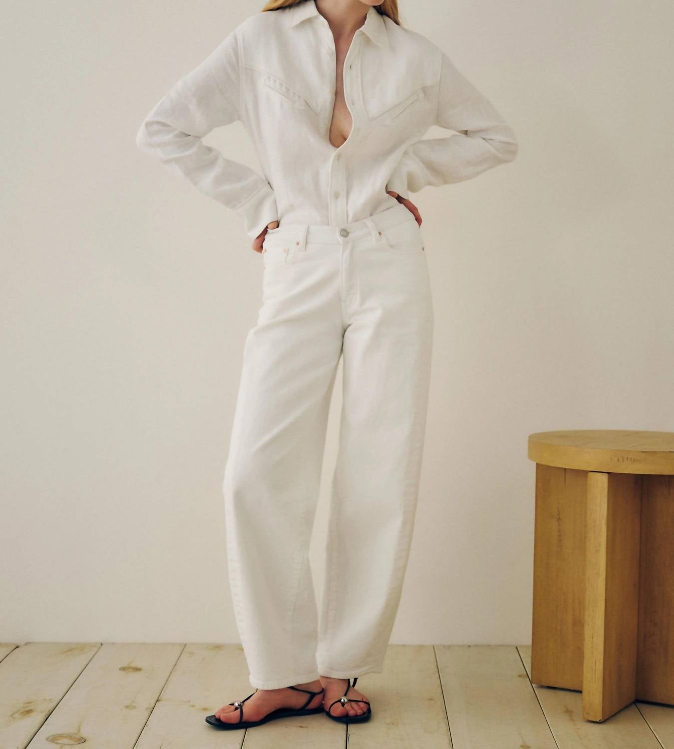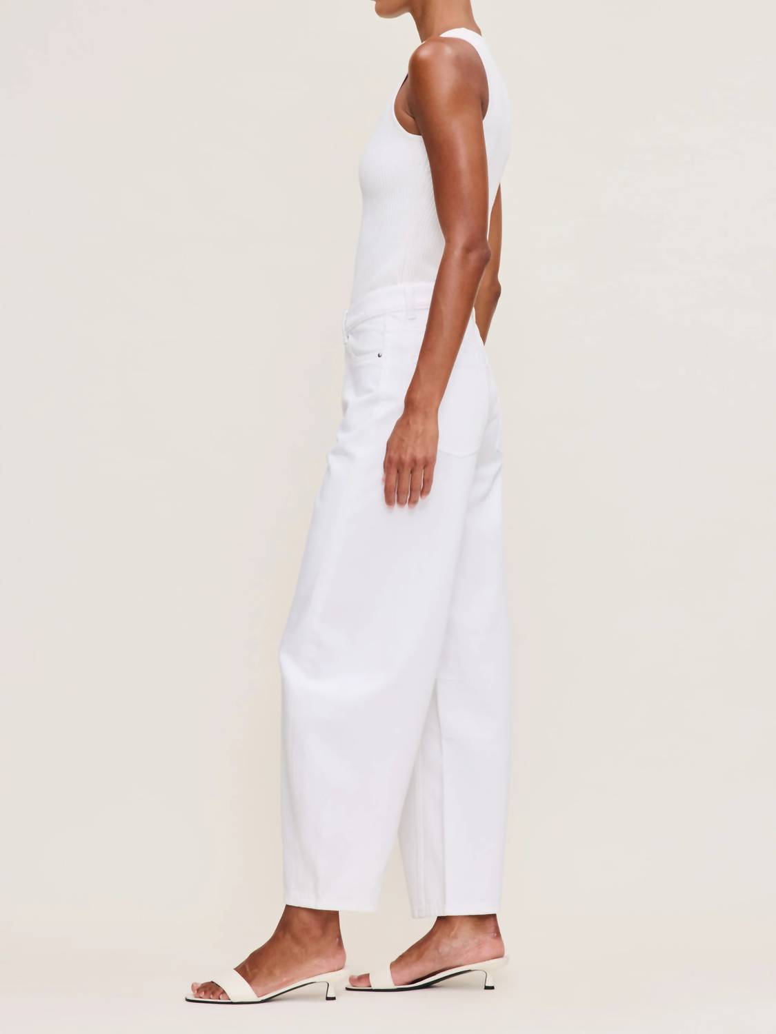 These must-have jeans are fit to perfection. Introducing the Miro Barrel Leg Jeans by DL1961 - Women's, a chic addition to your denim collection. These white jeans are crafted from 100% cotton and feature a high-rise fit with a voluminous barrel leg, styled to hit at ankle length with a tapered silhouette. Highlighted by silver hardware, tonal stitching, and a clean hem, they offer a minimalist aesthetic perfect for spring. Closure is a button closure, and they include convenient pockets. Care for these jeans is straightforward: machine wash cold and tumble dry low.