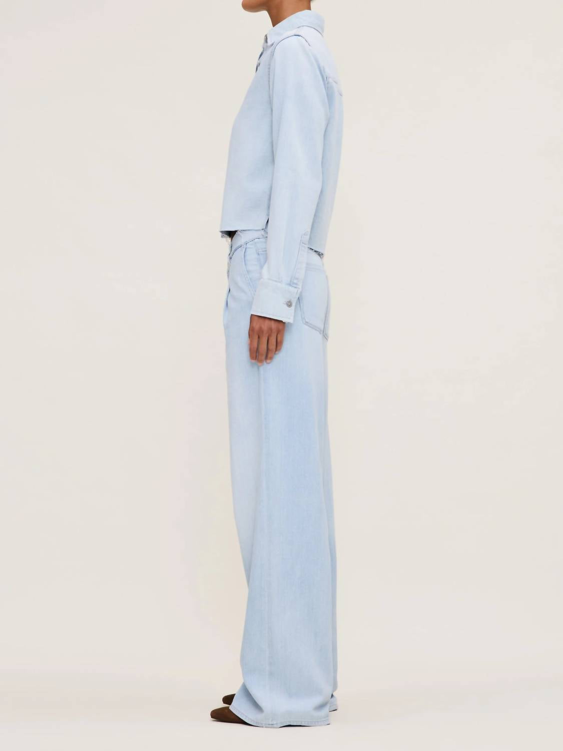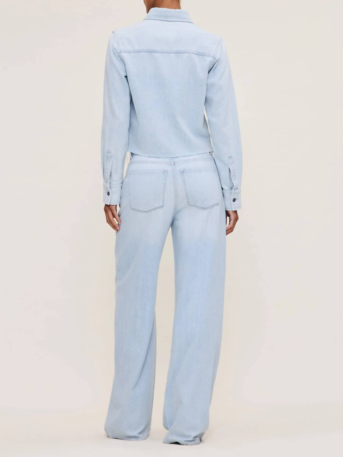 Perfectly tailored and soft to the touch. Discover the Montauk Long Sleeve Shirt by DL1961, a stylish button down essential for your wardrobe. Crafted from a cotton blend with 69% Cotton and 31% TENCEL™ Lyocell, this shirt boasts a boxy fit and a subtly cropped design. Its Poolside color features an ultra-light indigo wash for a vintage, worn-in look, complete with silver hardware and tonal stitching. Care for this solid, collar-neckline shirt is easy with machine wash and line dry instructions provided.