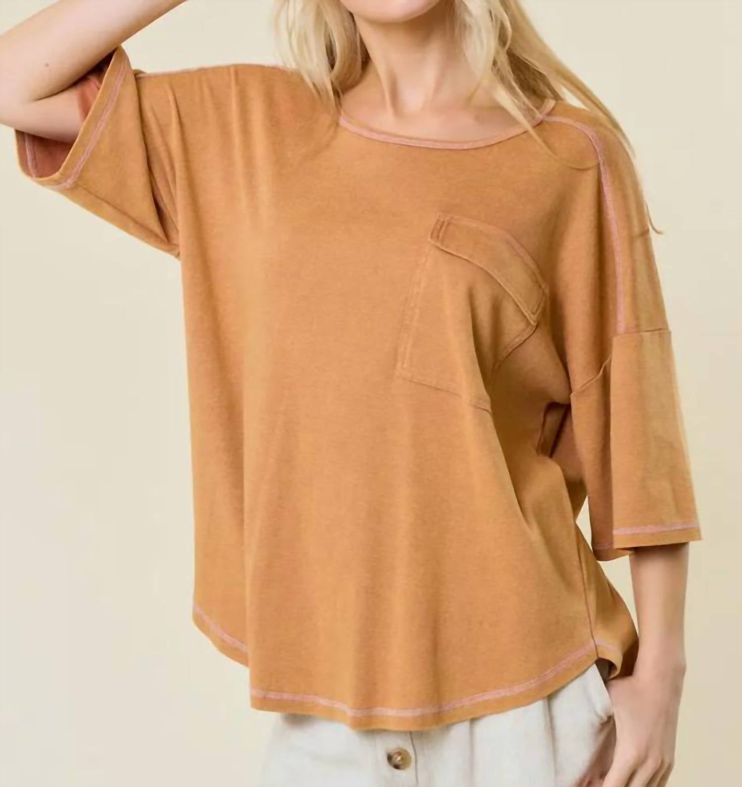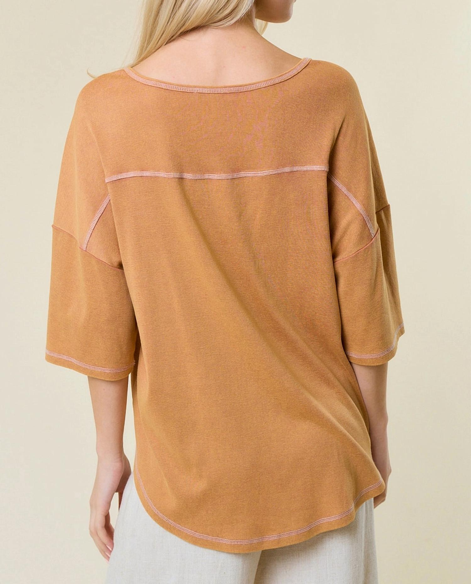 Pair this with your favorite jeans and slides for your next girls night out. Meet the Ginger Snaps Tee by Doe and Rae, the perfect blend of casual elegance for your wardrobe. This tee features three-quarter length sleeves and a classic crewneck, giving a nod to the traditional with a hint of modern style. The pull-on closure makes it effortlessly easy to wear, while the addition of a pocket adds a touch of practicality. Perfect for Thanksgiving get-togethers or a relaxed day at the beach, this solid brown piece fits seamlessly into your streetwear collection.