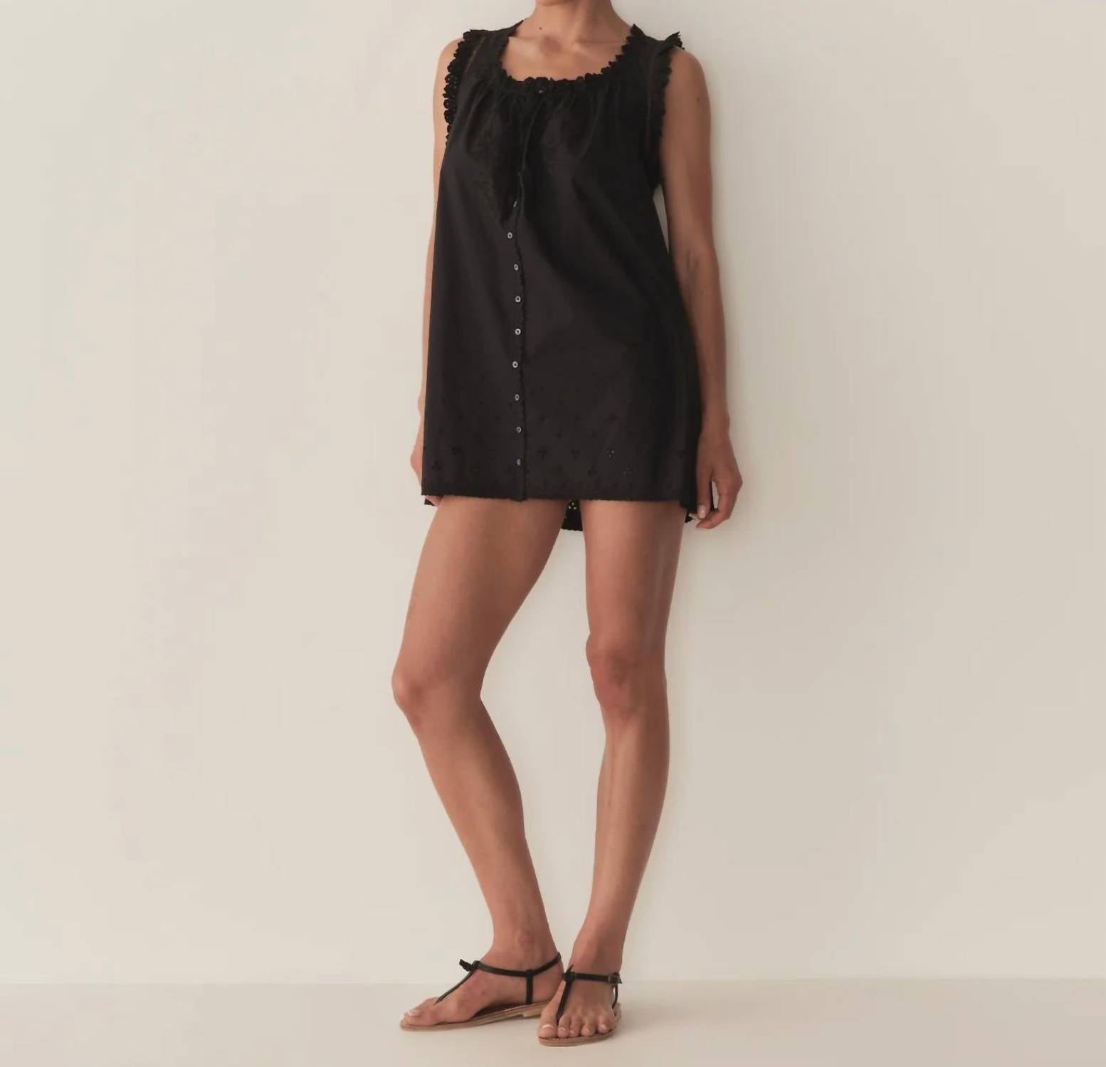 Introducing the Almadia Mini Dress by DÔEN, a chic black mini dress crafted from crisp organic cotton. This sleeveless shift design boasts a scoop neckline and features elegant details like mother-of-pearl buttons and a grosgrain ribbon tie. Made in India, it blends scallop eyelet embroidery with a floral eyelet design for a distinctly feminine touch. Closure: Button closure. Care: Machine wash, line dry.