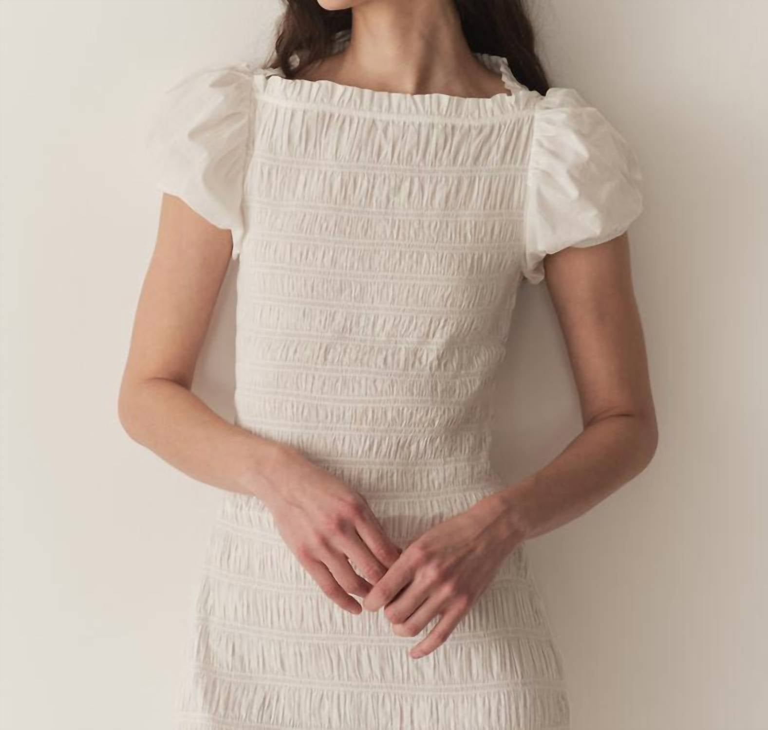 Embrace elegance with the Rizzo Dress by DÔEN, rendered in crisp white organic cotton poplin. This bodycon mini dress features short puffed sleeves and a boatneck, enhanced by allover elasticized smocking and a playful ruffle at the hem. Its pull-on design is crafted in India, ensuring quality and a flattering fit for any summer holiday party. Care for this minimalist piece by machine washing cold and hanging to dry, or opt for dry cleaning for added convenience.