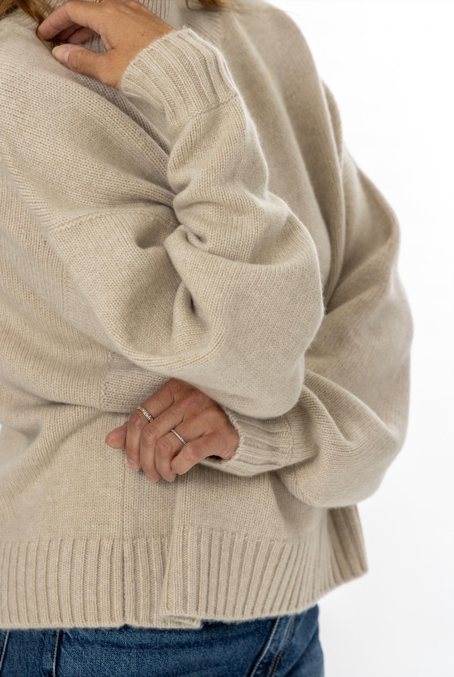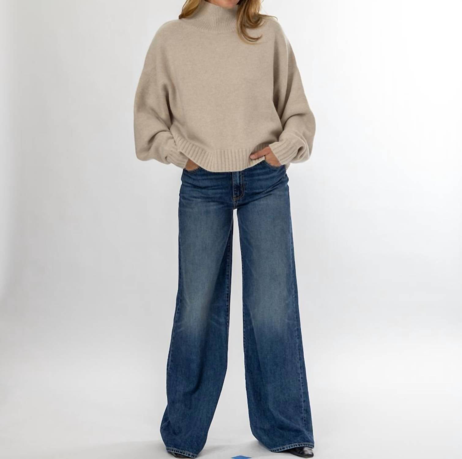 Layer under your favorite sweater or wear tucked into jeans for a perfectly polished winter look. The Devon Turtleneck in Millet by Doffer Boys offers a luxurious touch to your winter wardrobe. With its long sleeves and textured cashmere blend, this oversized turtleneck provides both warmth and style for the holiday season. The pullover design effortlessly complements its relaxed silhouette, featuring ribbed trims at the neckline, hem, and cuffs for added refinement. Perfect for holiday parties, it's a comfortable yet chic choice for women seeking a blend of elegance and coziness.