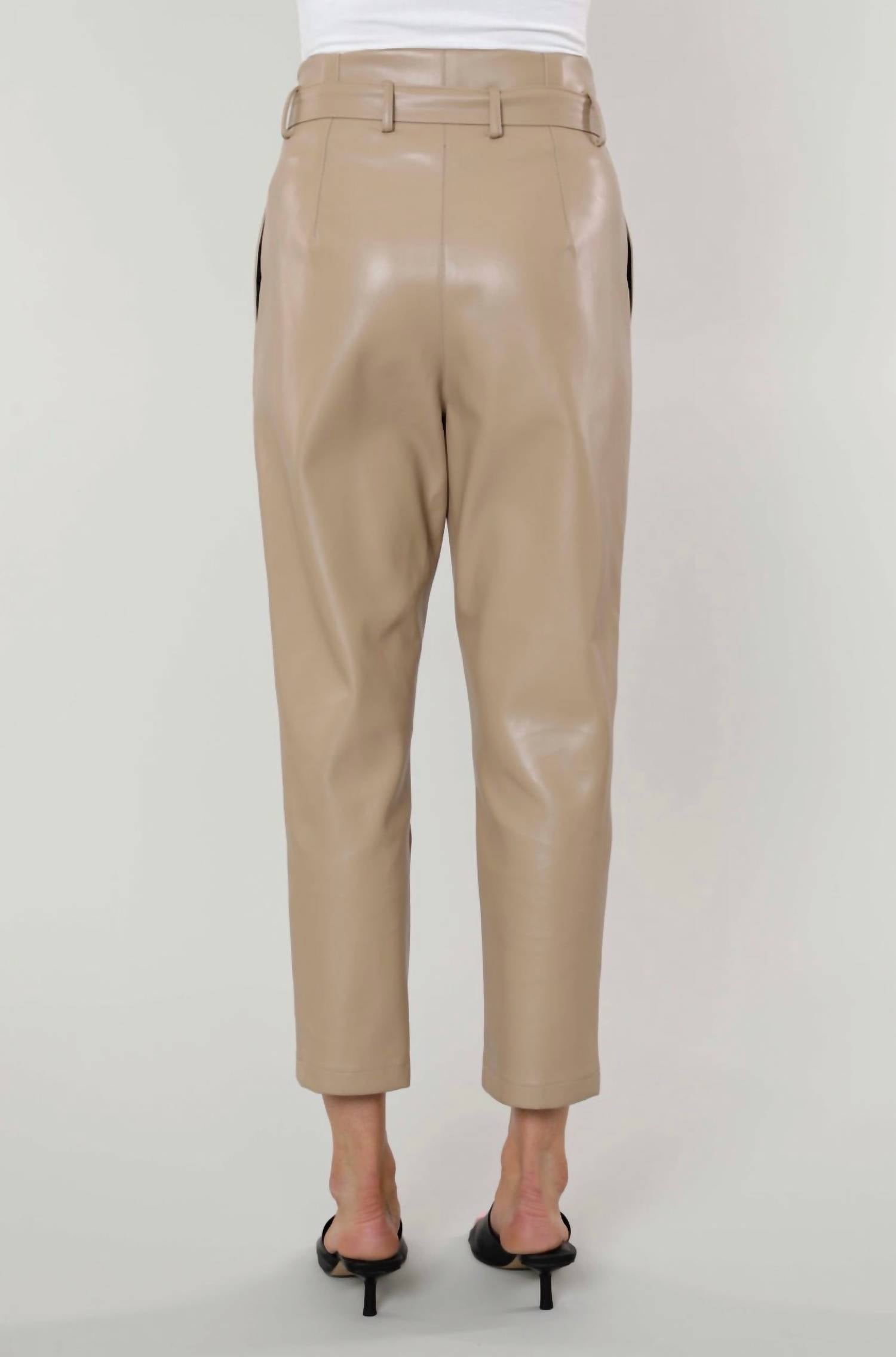 A straightleg pant that workes season after season. Dress these up with your favorite blouse or keep it casual with your go-to tee. Faux leather. Relaxed belted tie-waist. Mid-rise. 100% Polyurethane. True to size. The model is 5 9” and wearing size S. Dry clean.