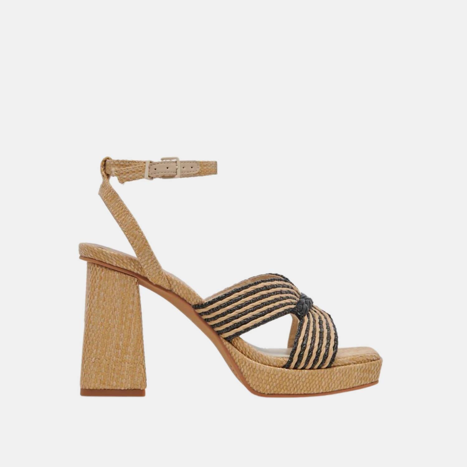 Heel Height- 3.5". Platform Height- 0.6". A chunky block heel. Subtle braided details. Recycled Raffia Upper. Recycled Synthetic Outsole. Synthetic Lining. Water-based Leather Alternative Lining + Sock