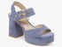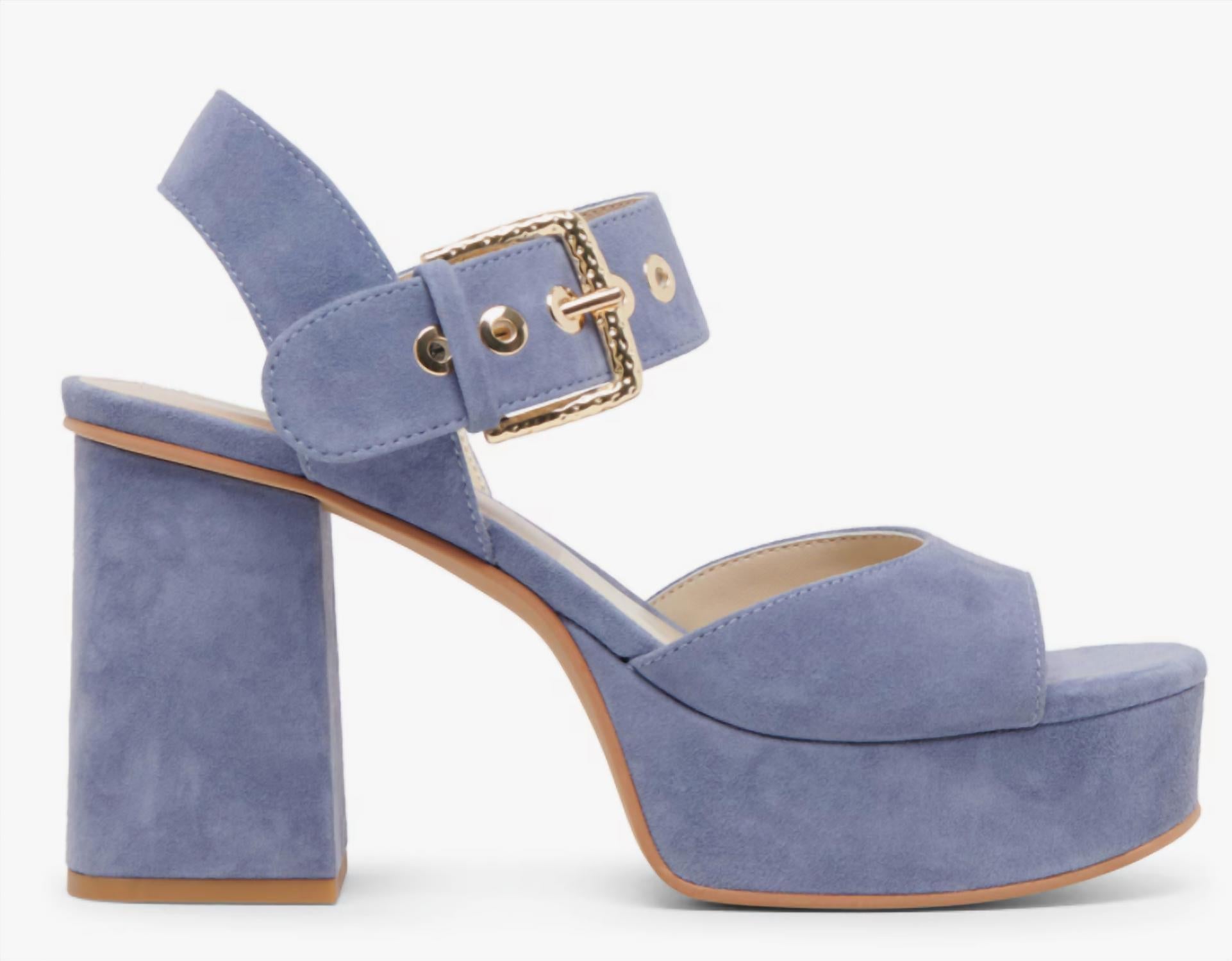 Step out in style featuring retro charm in a striking Bluebell suede hue. Platform heeled sandals showcase a high 3.5-inch chunky heel and a bold buckle strap closure, perfectly suited for a 90s fashion-inspired evening event. With an open toe design, crafted with a synthetic upper, lining, and sole for a seamless blend of fashion and function.