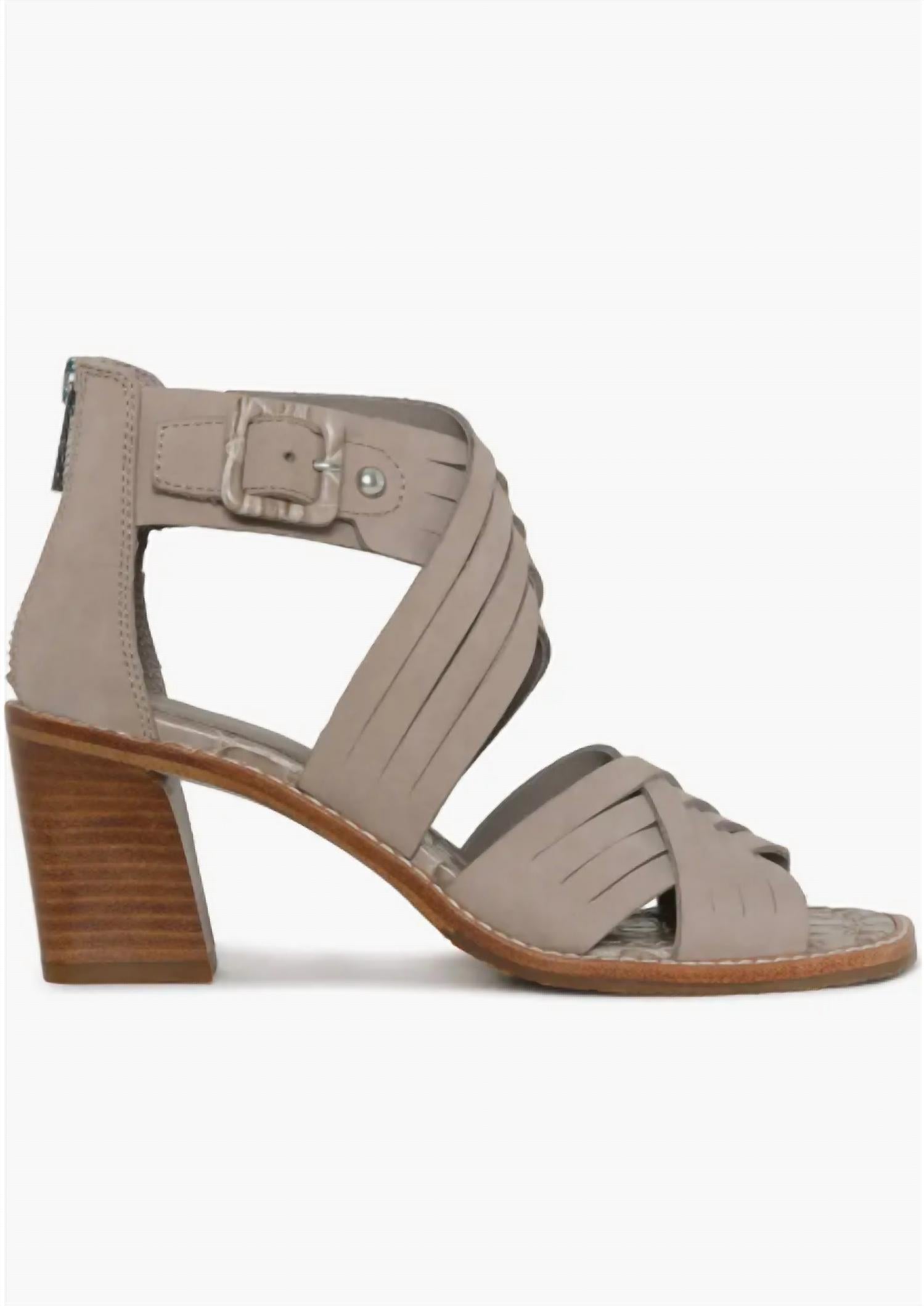 Step into style with the Women's Junnah Sandal by Donald Pliner, expertly designed in taupe nubuck for a chic look. These sandals feature wide leather straps that elegantly weave and crisscross, complemented by comfortable memory foam cushioning. A stacked 3-inch block heel elevates your stance, while a convenient back zip closure ensures easy wear. Crafted with a leather upper and lining, plus a durable synthetic and rubber sole, these sandals are imported for assured quality.