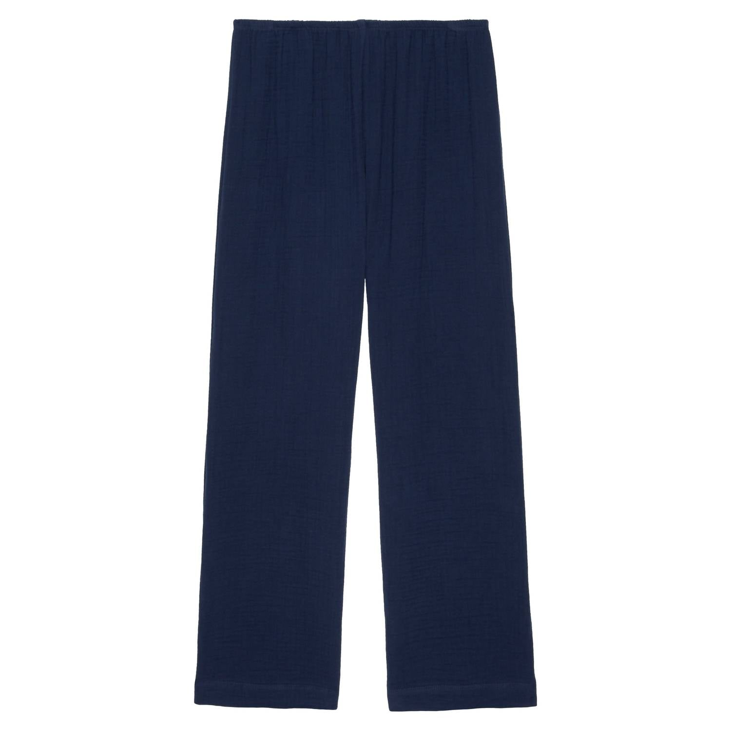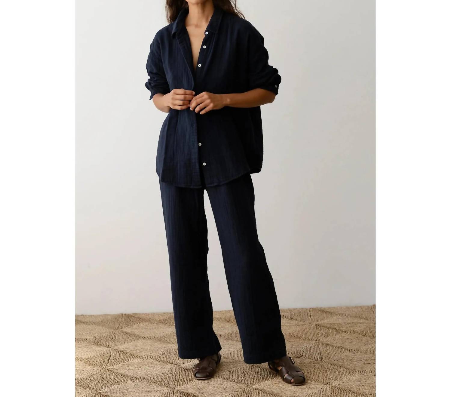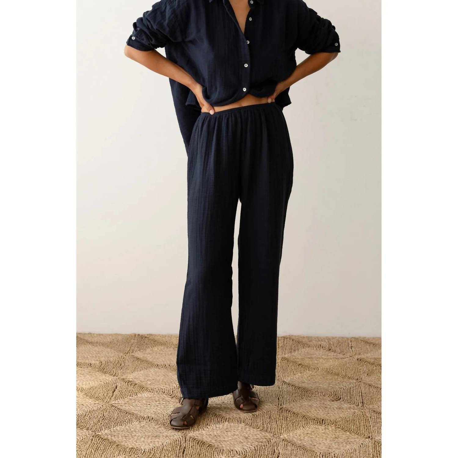 A straightleg pant that workes season after season. Dress these up with your favorite blouse or keep it casual with your go-to tee. Introducing the Bubble Crop Simple Pants by DONNI., a minimalist staple in navy that is perfect for holiday parties. These pants feature a wide leg, cropped fit with a comfortable high-rise elastic waistband, expertly crafted from lightweight 100% cotton gauze. Made in Los Angeles, they are designed with a pull-on closure for ease of wear. Care instructions include machine wash cold on a gentle cycle, tumble dry low, and avoid spot treatment or bleach. Maya is wearing a size Small (5'9" height, 34" bust, 25" waist, 35.5" hips).