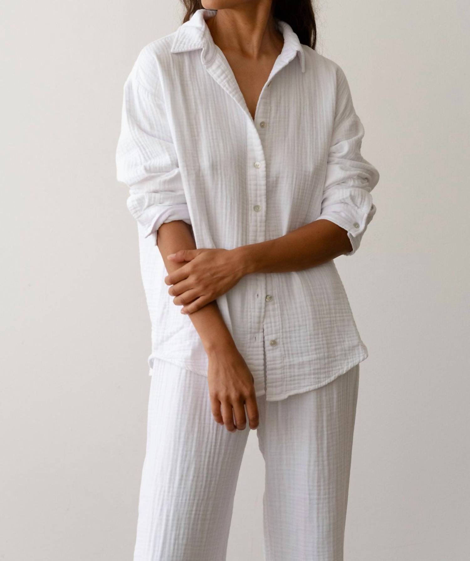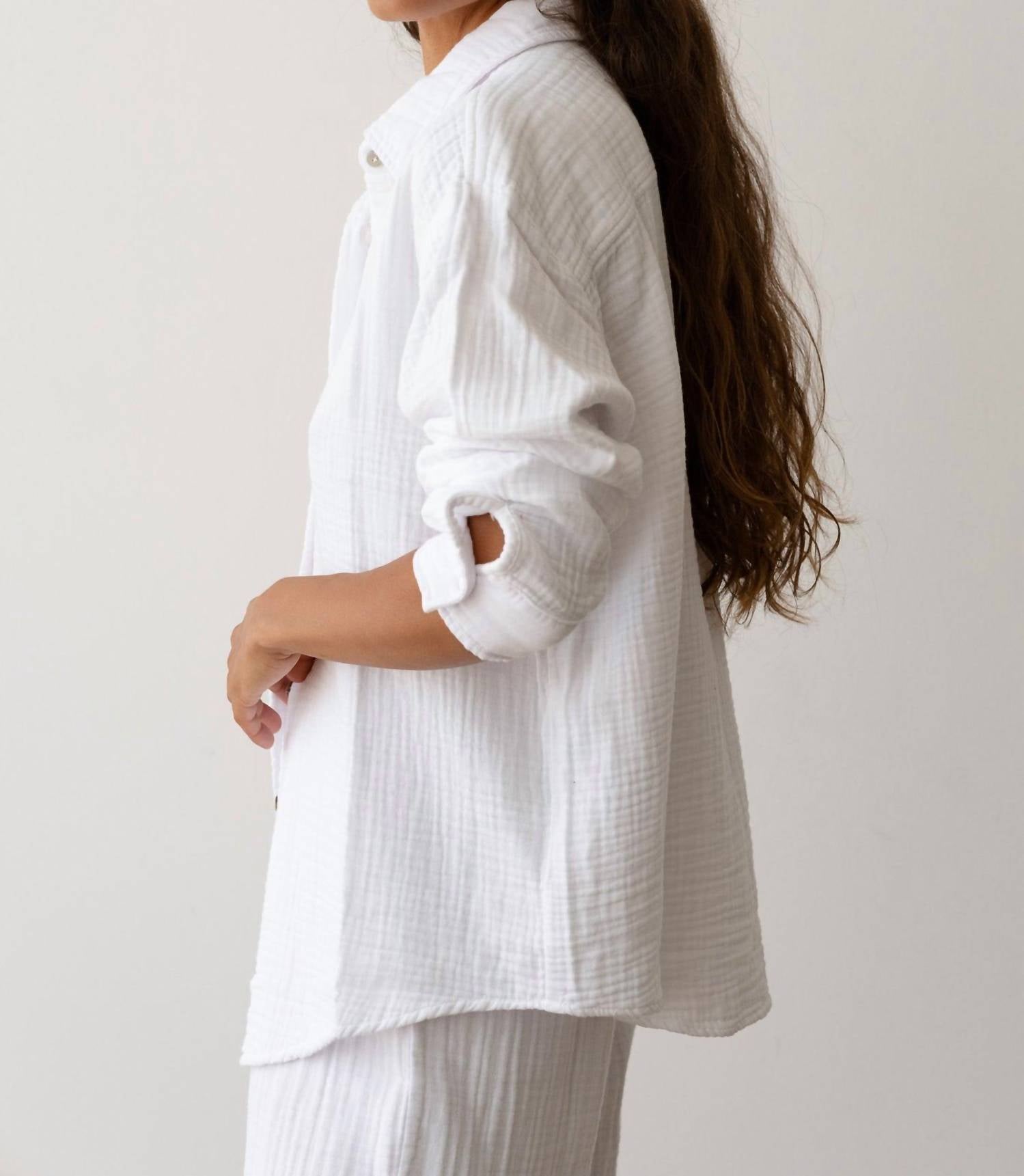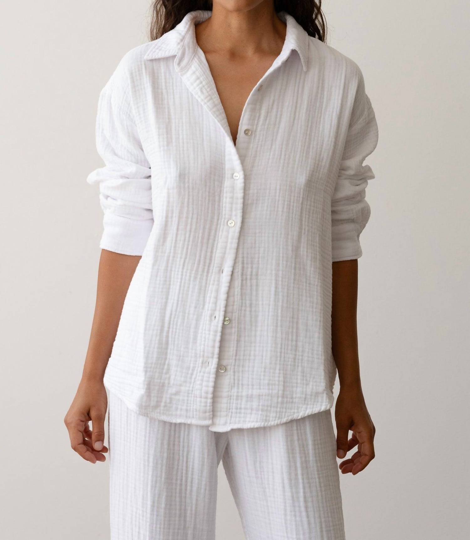 A timeless blouse that will never go out of style. Introducing the Bubble Shirt by DONNI., a Powder-colored summer essential designed to elevate your minimalist wardrobe. This long sleeve blouse is crafted from 100% cotton gauze, featuring a gauzy texture and a relaxed fit for ultimate comfort. Made in Los Angeles, it boasts elegant mother of pearl button closures and fits true to size. Care for it effortlessly with machine wash cold and gentle cycle instructions, followed by a low tumble dry. Model Maya stands at 5'9" with measurements 34" bust, 25" waist, and 35.5" hips, dressed in size Small.