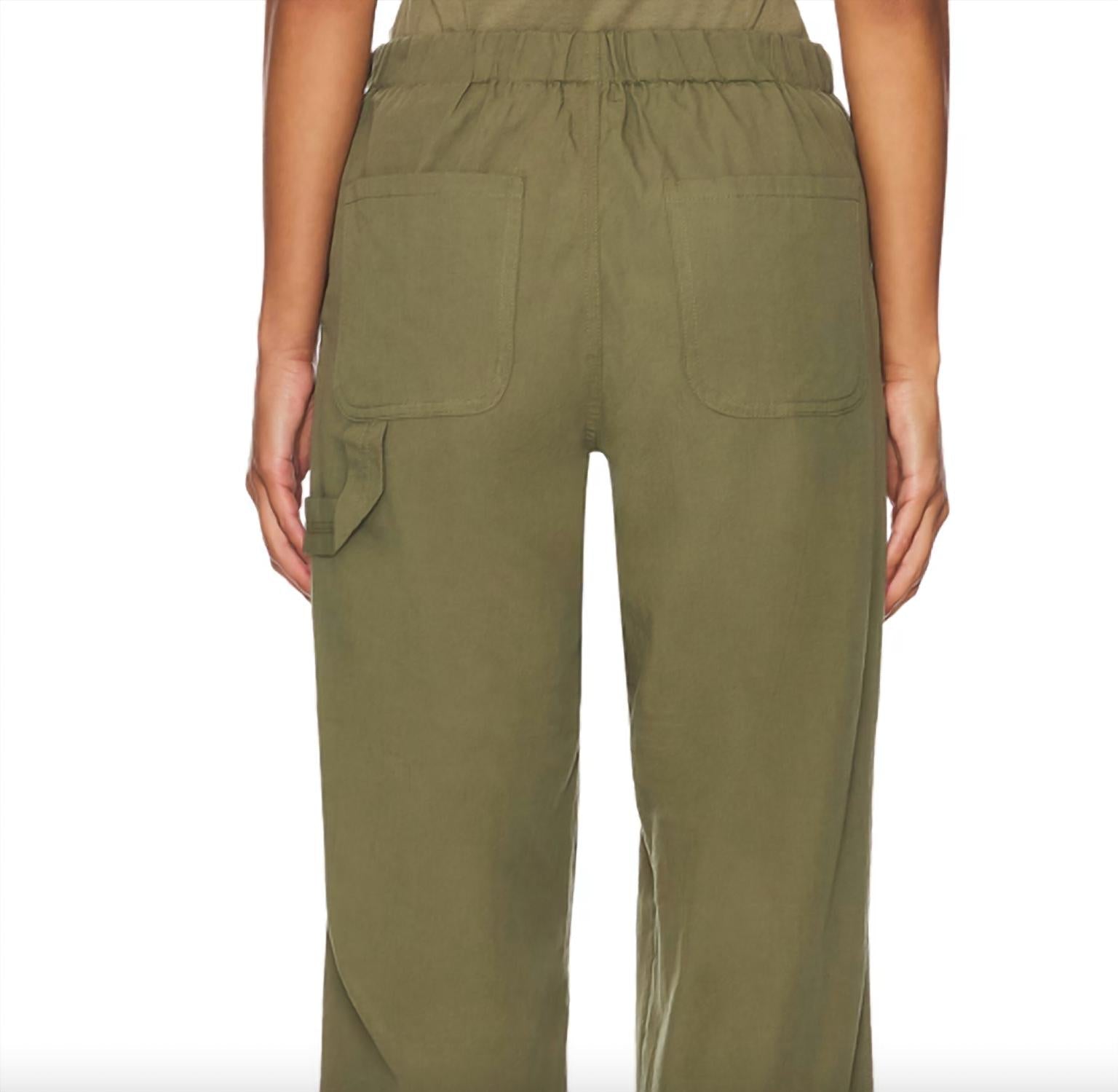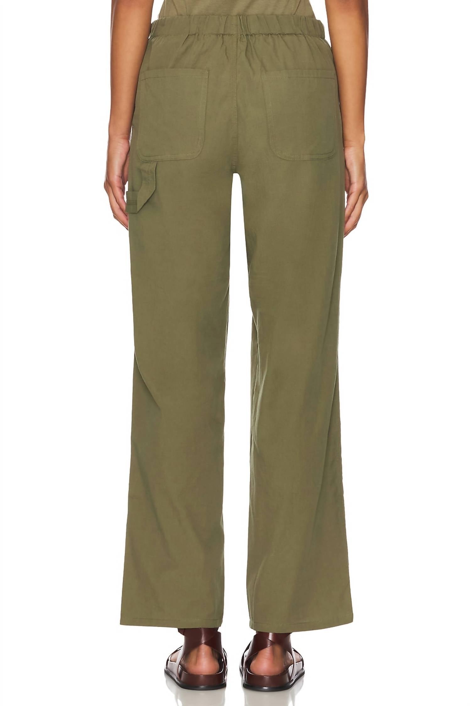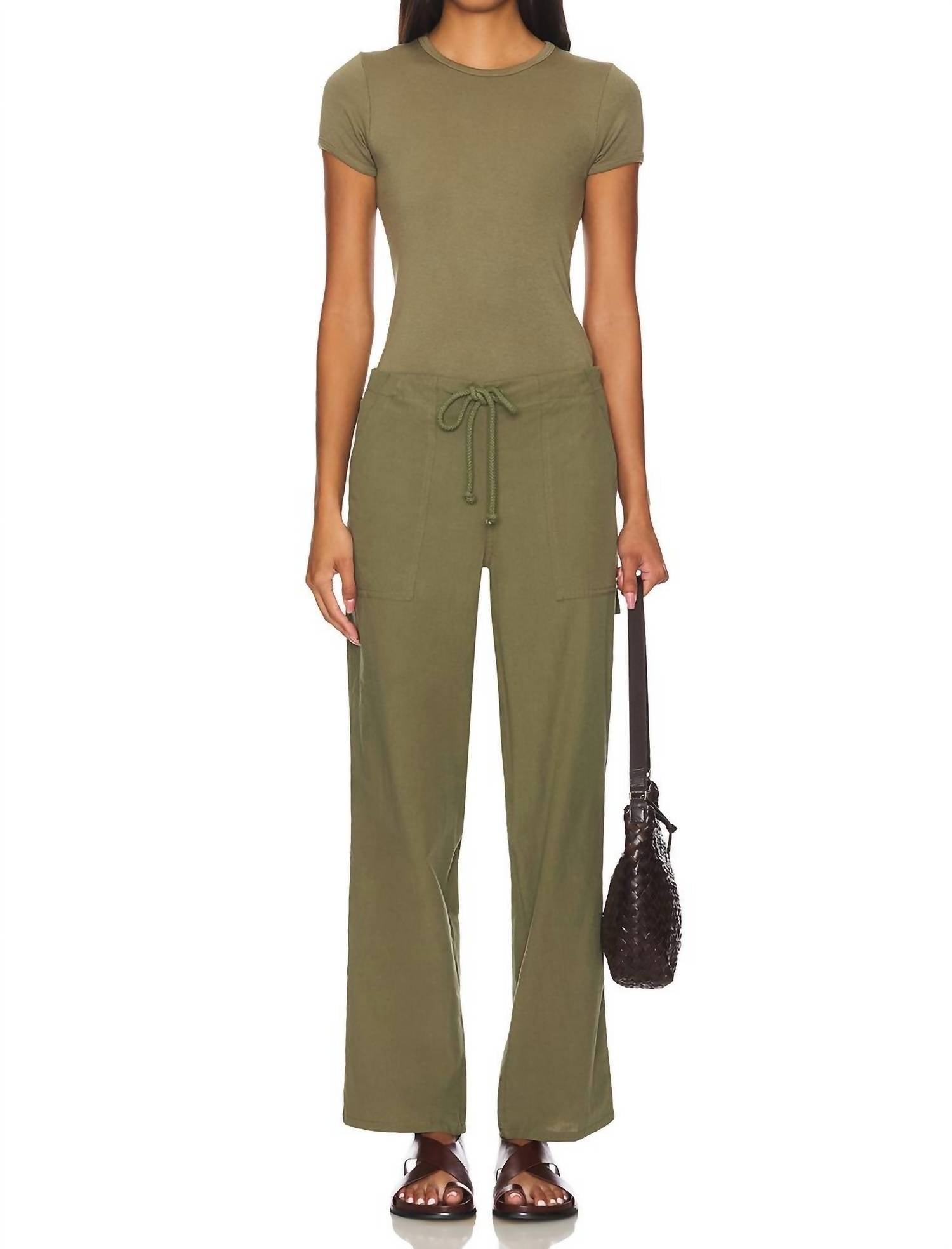 This straightleg pant is both stylish and comfortable. Did we mention the fit is perfection? Introducing the Sandwash Painter Pant by DONNI., a stylish choice in Olive that combines comfort with a relaxed look. These pants feature a high rise with pull-on styling and a drawstring at the waist, offering a perfect fit for any occasion. Crafted from 100% cotton in the USA, they ensure durability and a soft feel. With side slant and back pouch pockets, this straight-leg silhouette measures 48 cm at the knee and leg opening, with an inseam of 30 inches and a rise of 11 inches. Machine wash and tumble dry for easy maintenance.