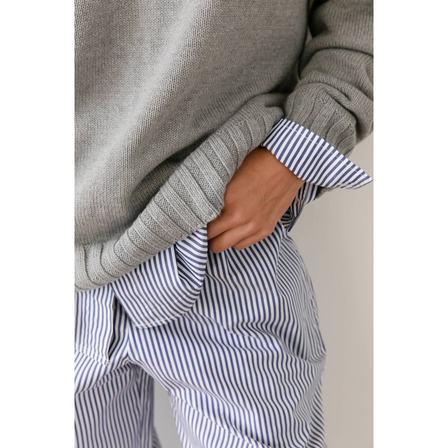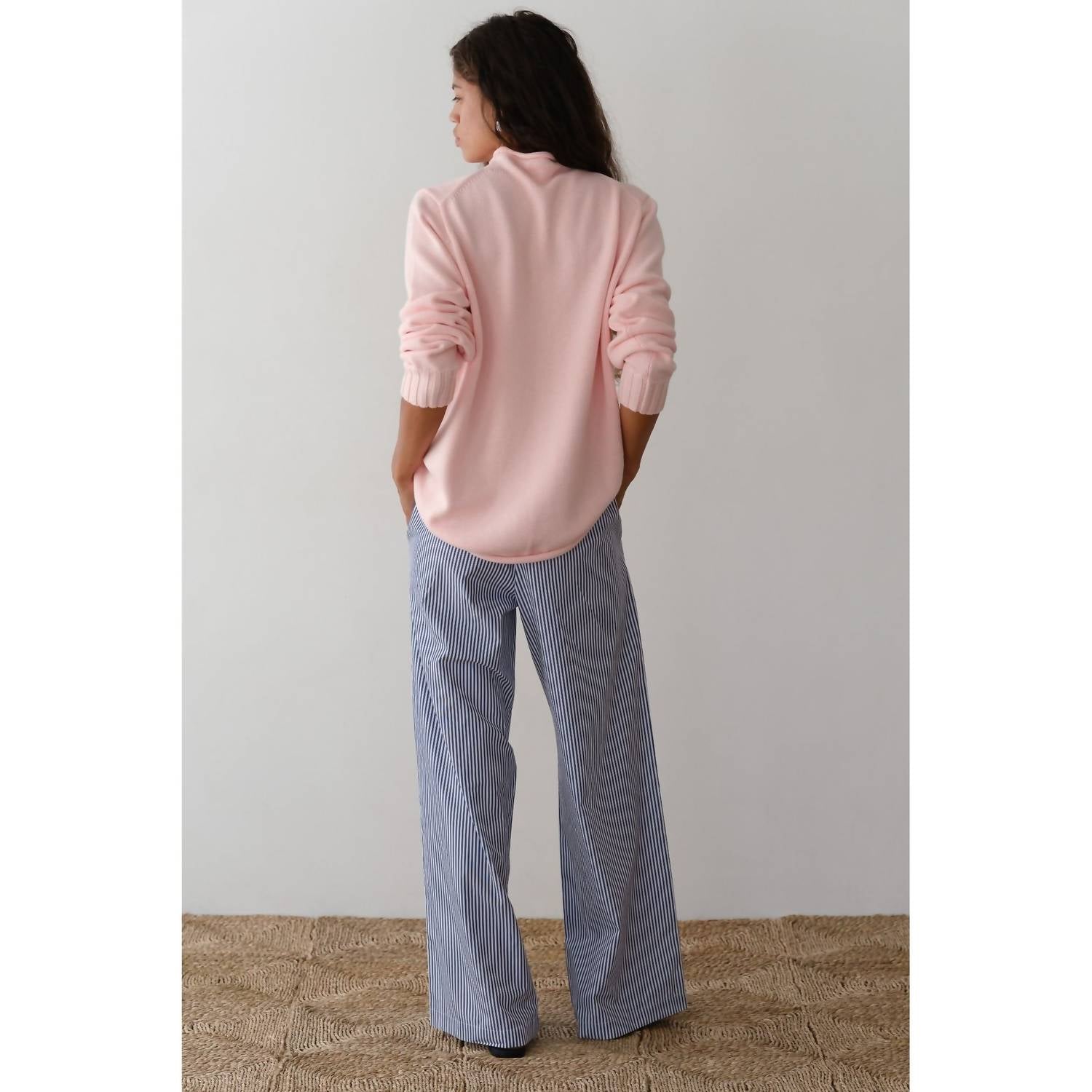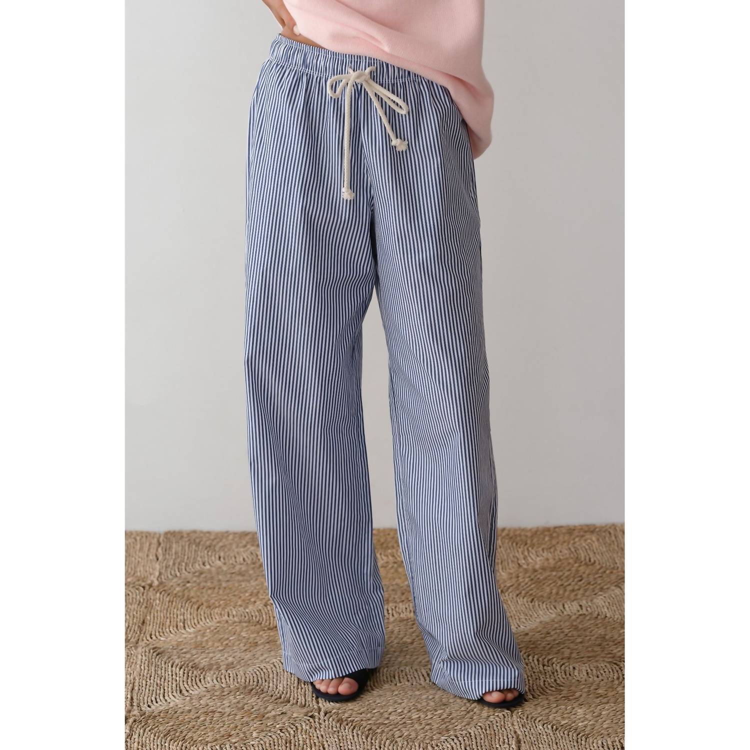 A perfectly tailored straight leg that you'll want in every color! Introducing the Stripe Pop Pants by DONNI., an essential piece crafted from 100% cotton poplin in an elegant navy stripe. With a comfortable wide-leg fit and customizable rise, these pants boast a drawcord waist for ease. Made in LA, they feature a pull-on closure and are perfect for minimalist spring wardrobes and holiday parties. The straight leg design with pockets adds a functional touch to this versatile clothing item.
