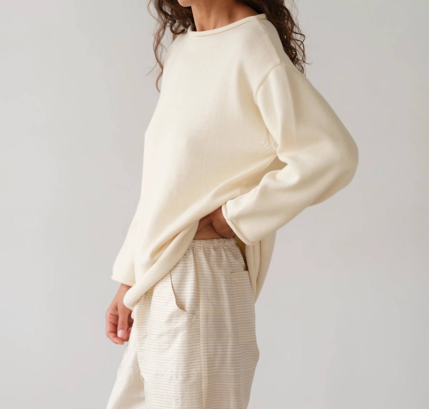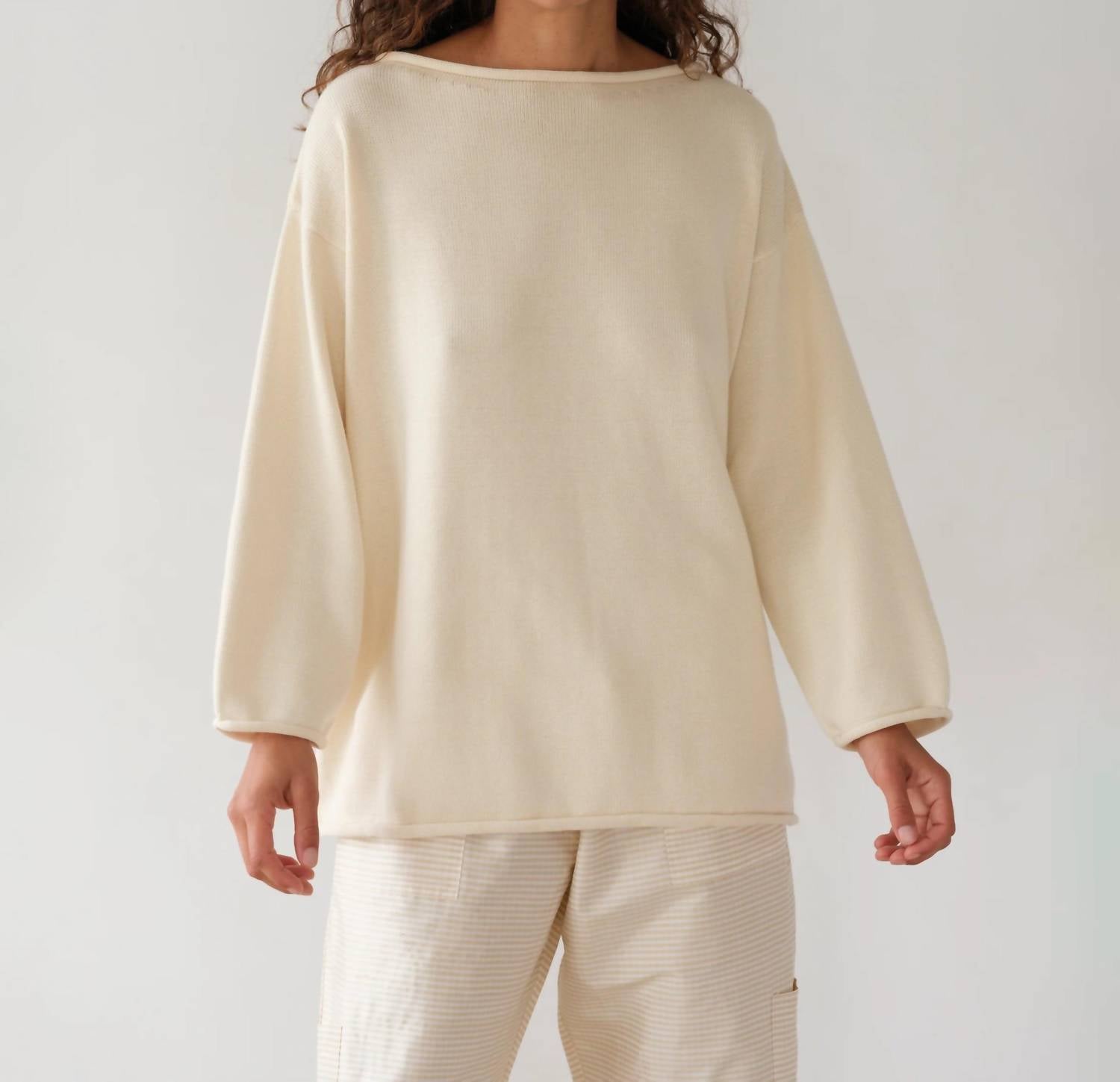 A classic fit that works just as good buttoned as it does left open. Discover the Boatneck Sweater by DONNI., a minimalist piece perfect for the Spring season. This creme-colored sweater features long sleeves and is crafted from 100% organic cotton, ensuring a breathable and soft feel. Made in the USA, it boasts a relaxed, oversized fit with a boat neckline, completed by subtle rolled edges. Closure: Pull on. Care: Machine wash cold with like colors, lay flat to dry, avoid spot treating and bleach.