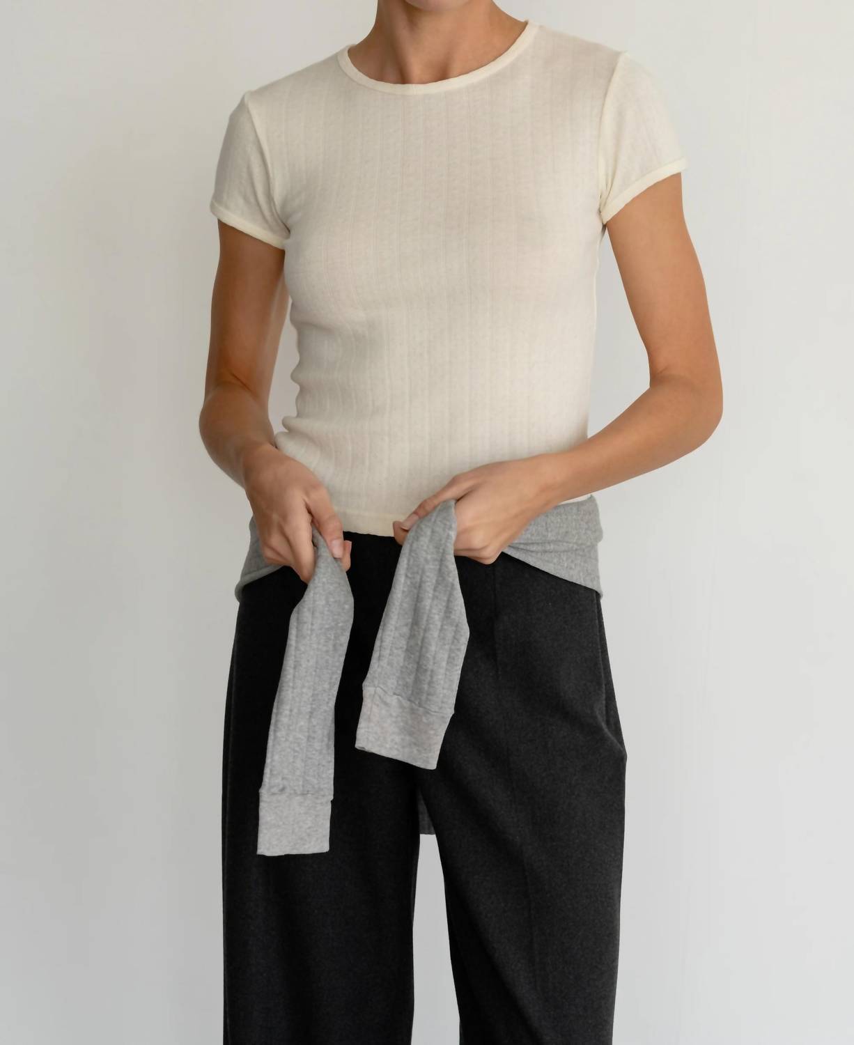 Introducing the Pointelle Baby Short Sleeve Tee by DONNI., a chic minimalistic essential in a soft cream hue. This tee is made from 100% organic cotton and features a slim-fit with a crewneck and flattering cap sleeves. Made in Los Angeles, the design is finished with a convenient pull-on closure. Easy care instructions include machine washing cold on a gentle cycle and either tumble drying low or laying flat to dry.