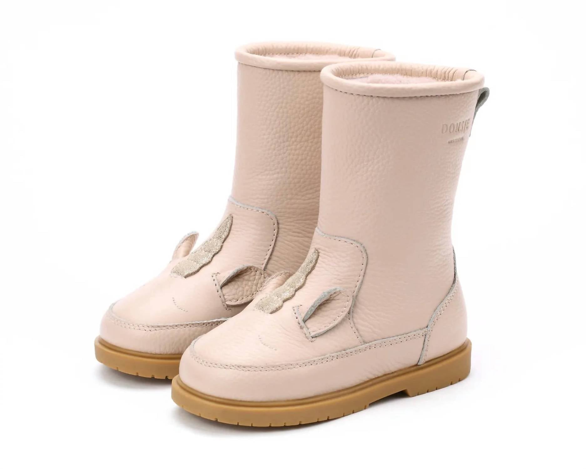 Introducing the Kid's Wadudu Special Lining Unicorn Boots by Donsje, a delightful addition to your child's wardrobe in Light Rose Leather. These handmade boots feature a 100% premium leather exterior with a cozy sheep wool lining, ensuring comfort and warmth during fall escapades. Designed with a flat heel and round toe, they feature a rubber outsole for sturdy traction, perfect for travel and play. The easy slip-on design makes them a practical choice for little adventurers, offering both style and functionality.