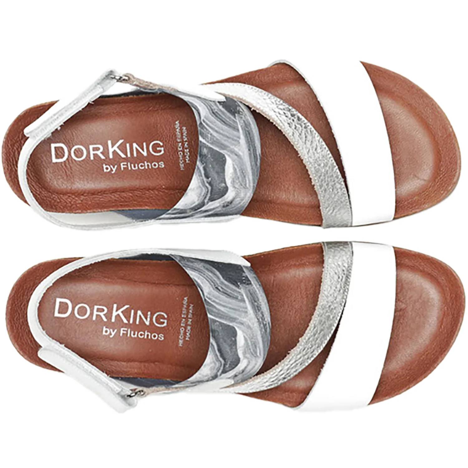 Classicly cute and all-day-wearable. We love this sandal. Step into comfort and style with the Women's Agnes D8786 Sandal by Dorking by Fluchos, showcased in a striking Blanco/Grafito/Plata colorway. These sandals feature a premium leather upper and a durable rubber outsole, ensuring support and longevity. The adjustable velcro closure backstrap offers a customizable fit, while the pronounced arch support contributes to all-day comfort. Designed with a 1.96" wedge heel, these sandals provide just the right lift, ideal for a breezy, elegant look.
