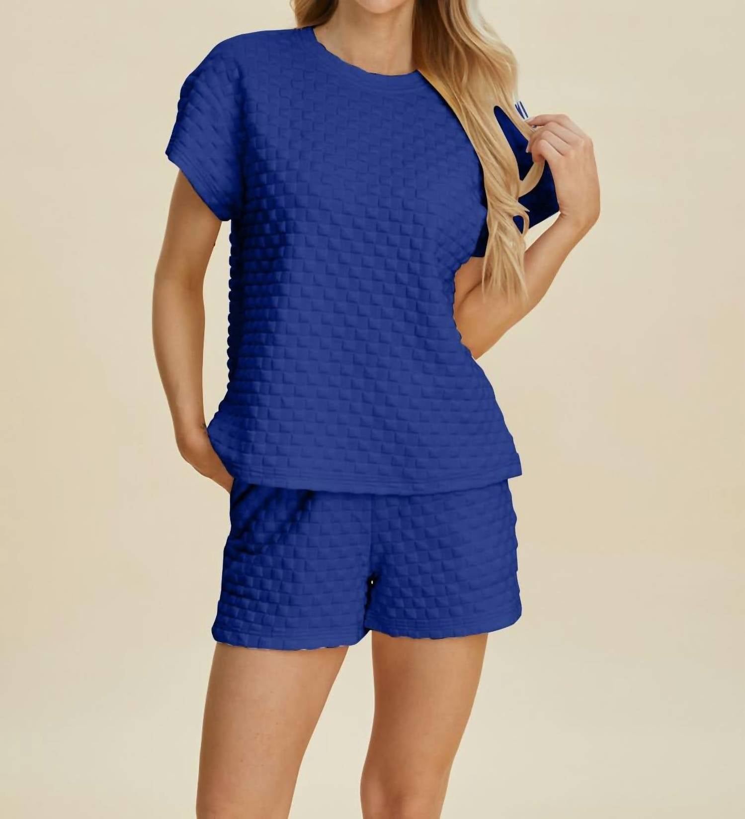 This Sleek Texture T-Shirt & Shorts Set is made from 95% polyester and 5% spandex for a comfortable, slightly stretchy fit. The T-shirt features short sleeves and a crewneck, while the shorts have a drawstring, both with pull-on closure and easy care instructions.