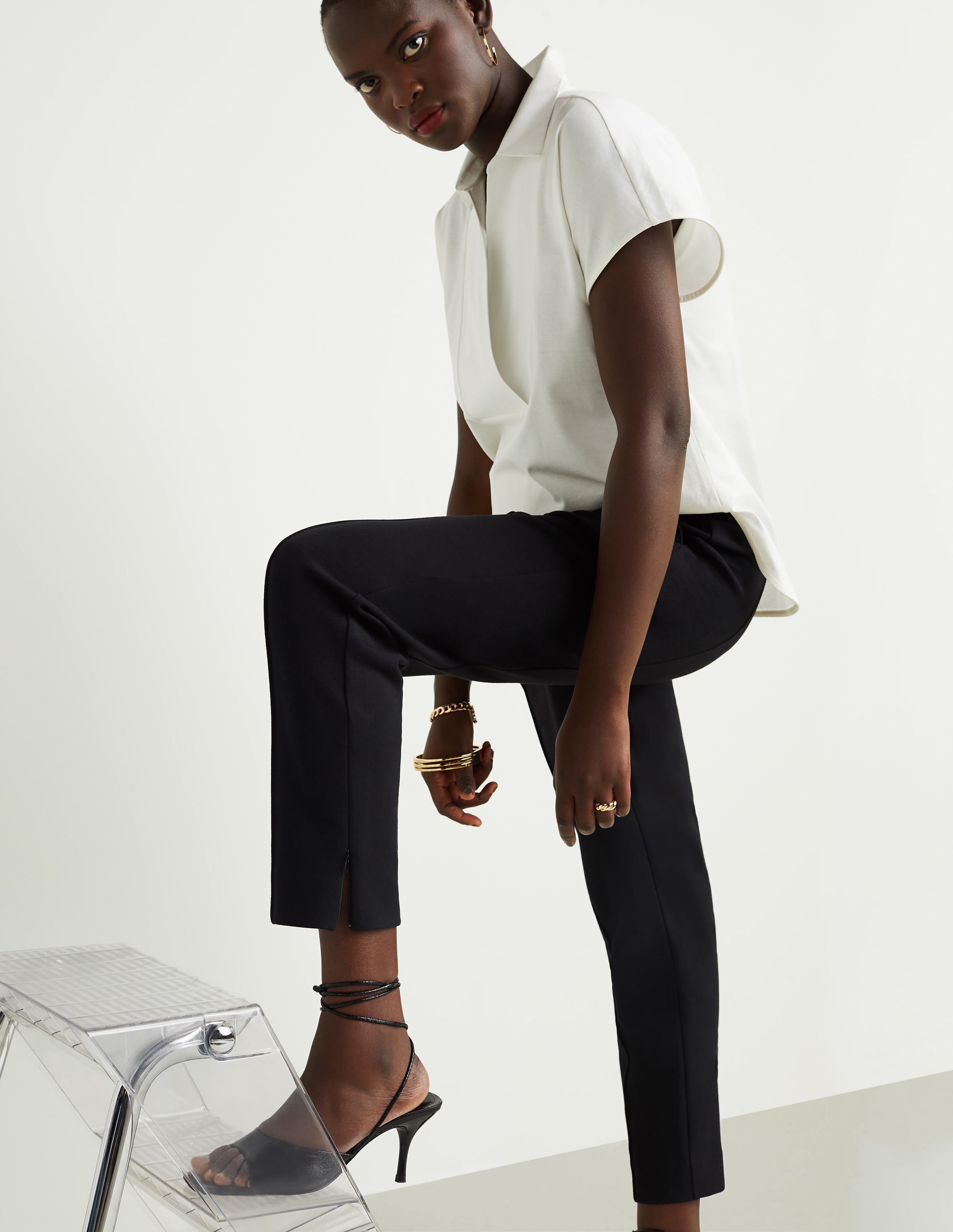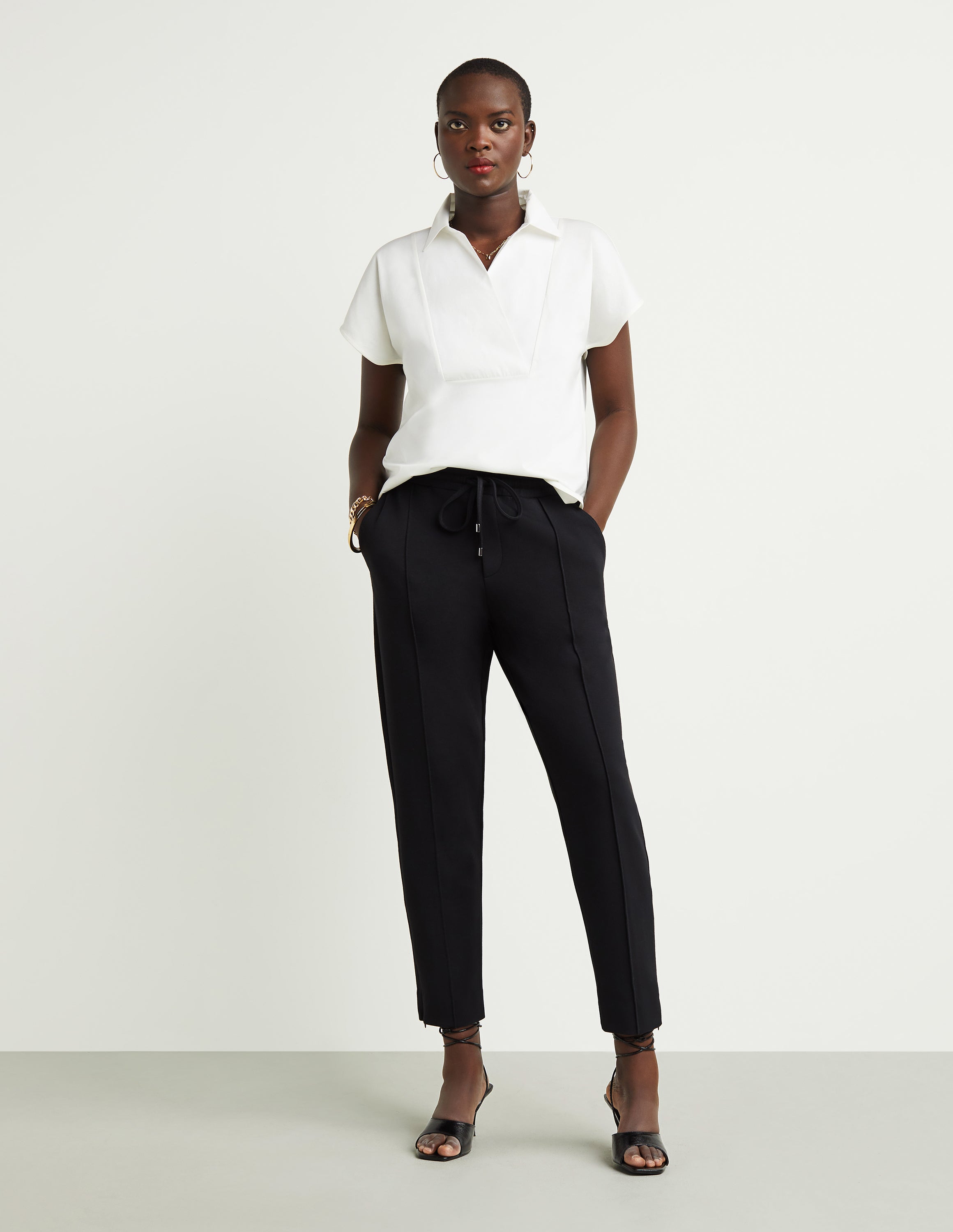 More is more. What if your go-to work pants merged with your favorite sweats? We made it happen with a mash-up that’s even greater than the sum of its parts. The best features of an office pant—pin-tuck creases, slant pockets, tailored legs—combined with the laid-back feel of athleisure, create something new that manages to be both relaxed and totally put together.