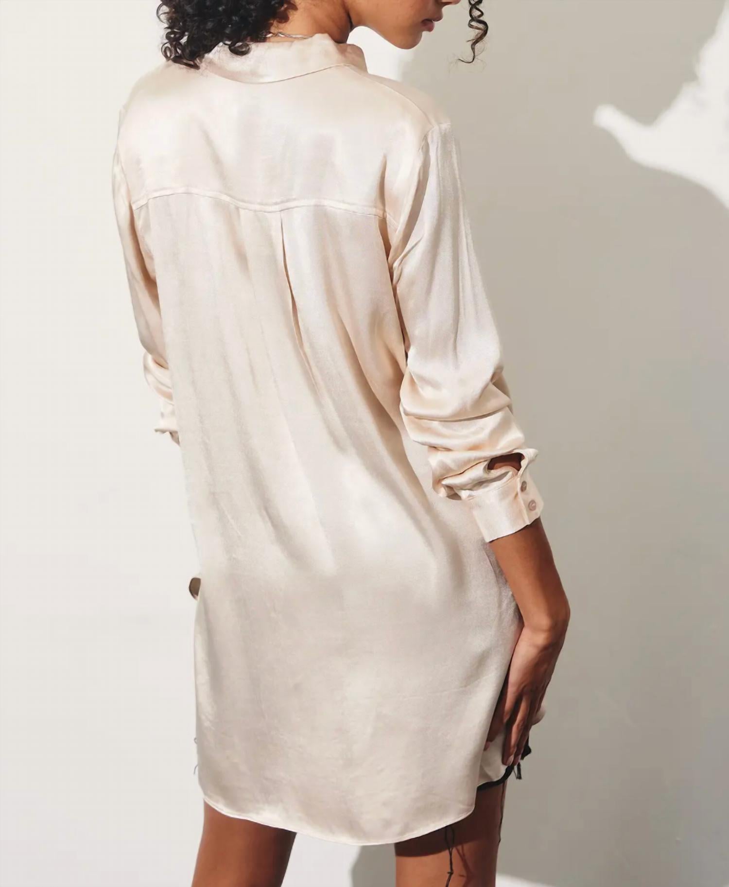 Perfectly tailored and soft to the touch. The "Take It Easy Satin Shirt" by DRESS FORUM showcases elegant long cuffed sleeves and a slightly long bodice for a sophisticated silhouette. Crafted from a silky champagne solid composition of 52% Rayon and 48% Viscose, it offers a luxurious touch. This women's shirt features front button closures and a classic collared neckline, perfect for Thanksgiving or an evening event. Available in sizes Small, Medium, and Large, it effortlessly blends quiet luxury with versatility.