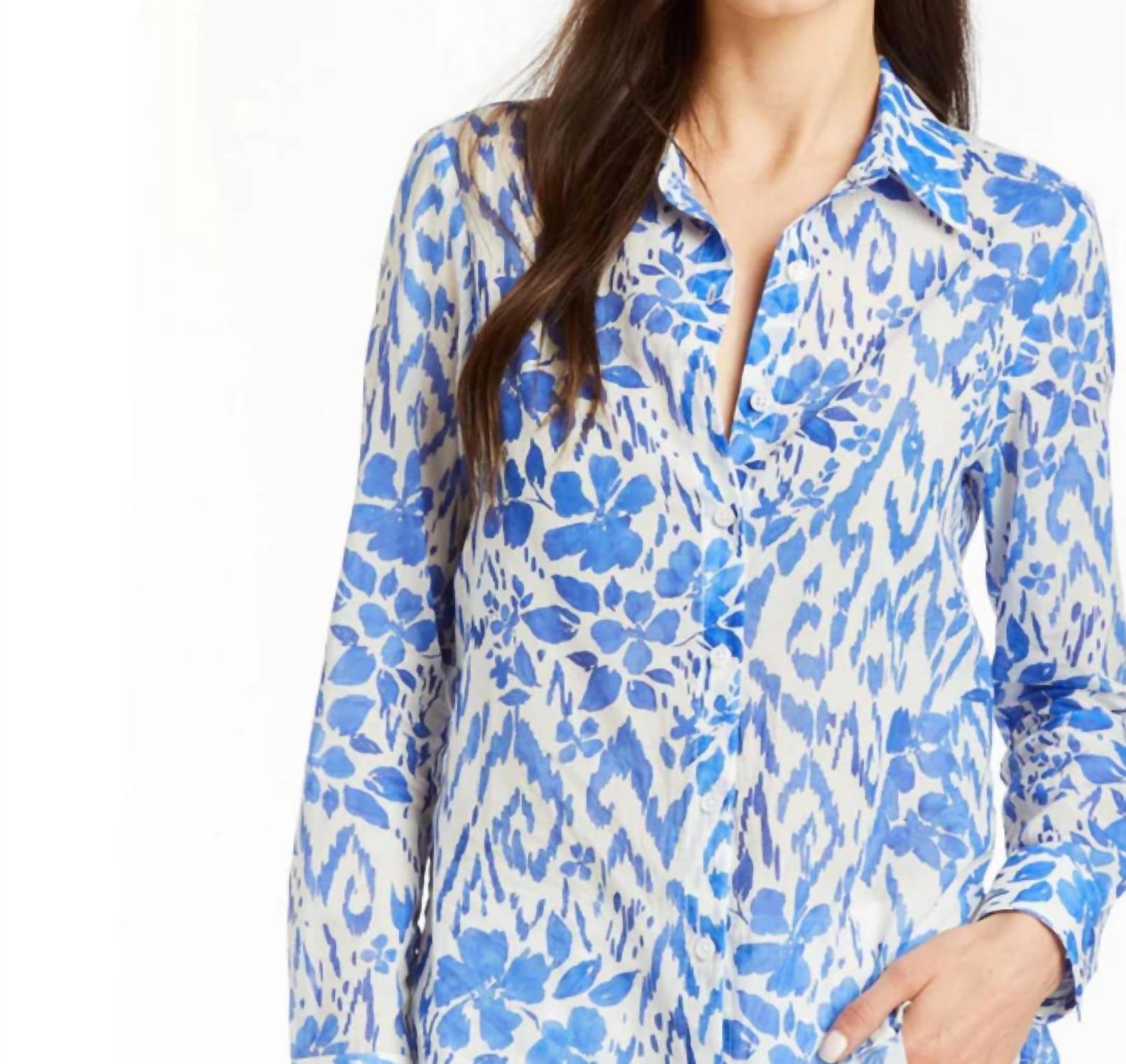 Introducing the Natalee Blouse by DREW, a perfect choice for a summer vacation with its minimalist, patterned blue design. This women's top features long sleeves and a classic collar, offering an effortlessly stylish look. Crafted with attention to detail, it includes a button closure for ease of wear. Care for this blouse by hand washing and line drying to maintain its pristine condition.