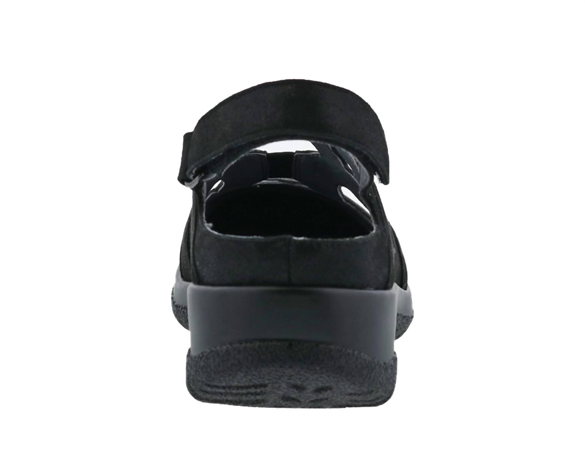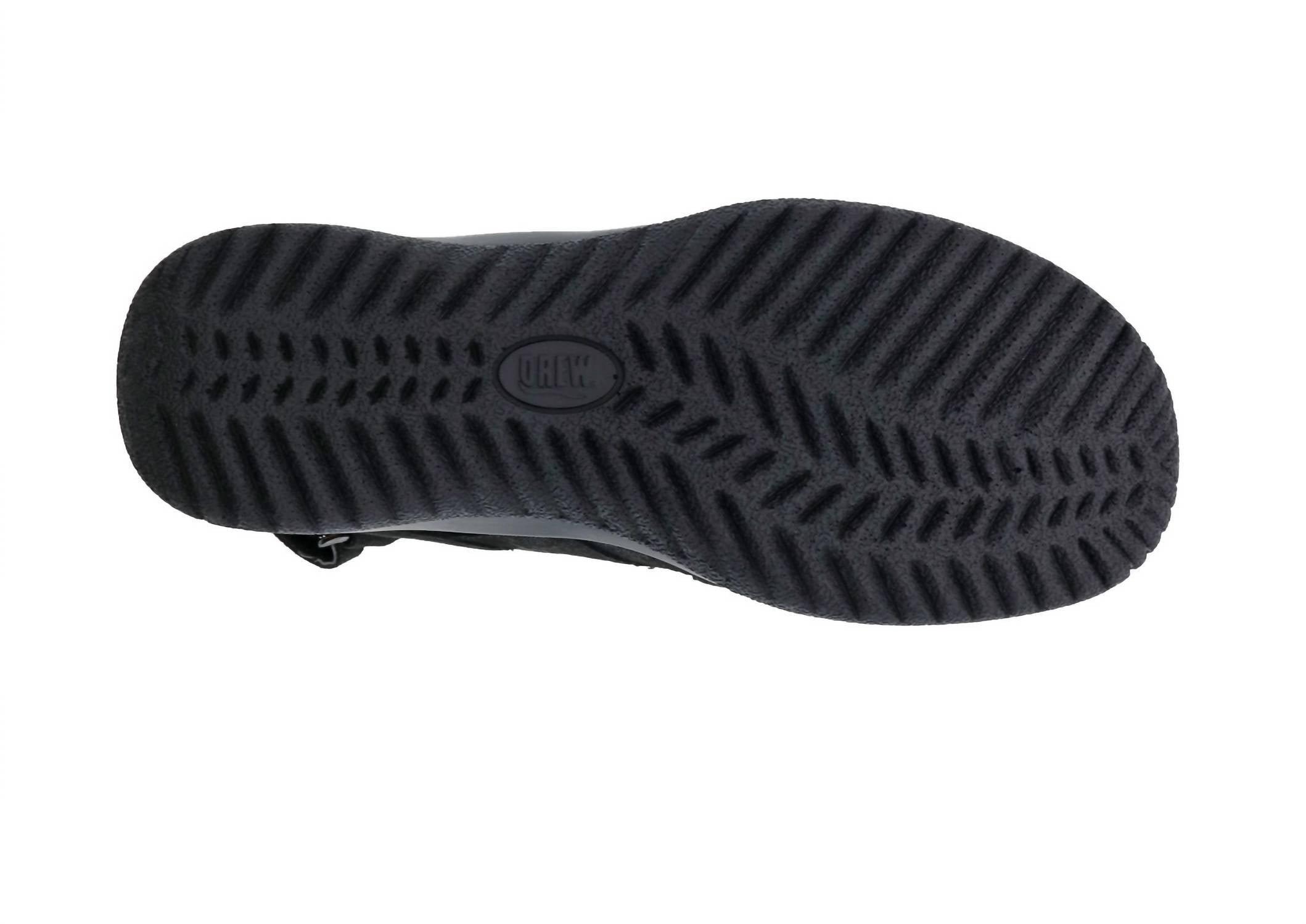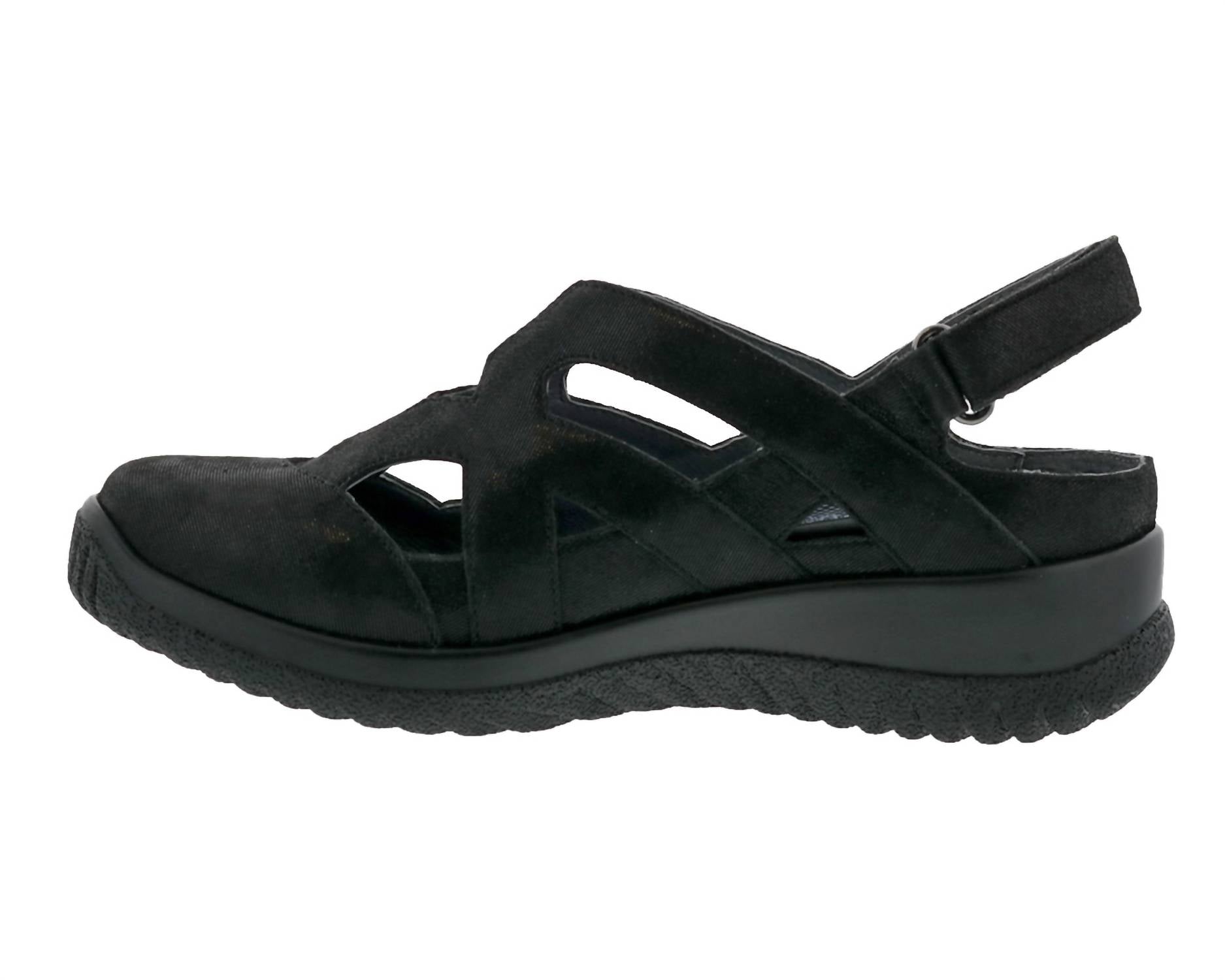 Experience unbeatable comfort with the Women's Smiles Casual Sandal by Drew Shoes, perfect for those long summer strolls. Crafted from premium leather, this sandal features a convenient hook and loop adjustable ankle strap for a secure fit, alongside a fully padded, removable footbed for personalized comfort. The flexible polyurethane outsole, tempered steel shank, and Plus Fitting System® provide firm support and double depth, making it ideal for accommodating prescribed orthotics. Enjoy the stylish black microdot design with a practical low flat heel measuring 1.25 inches.
