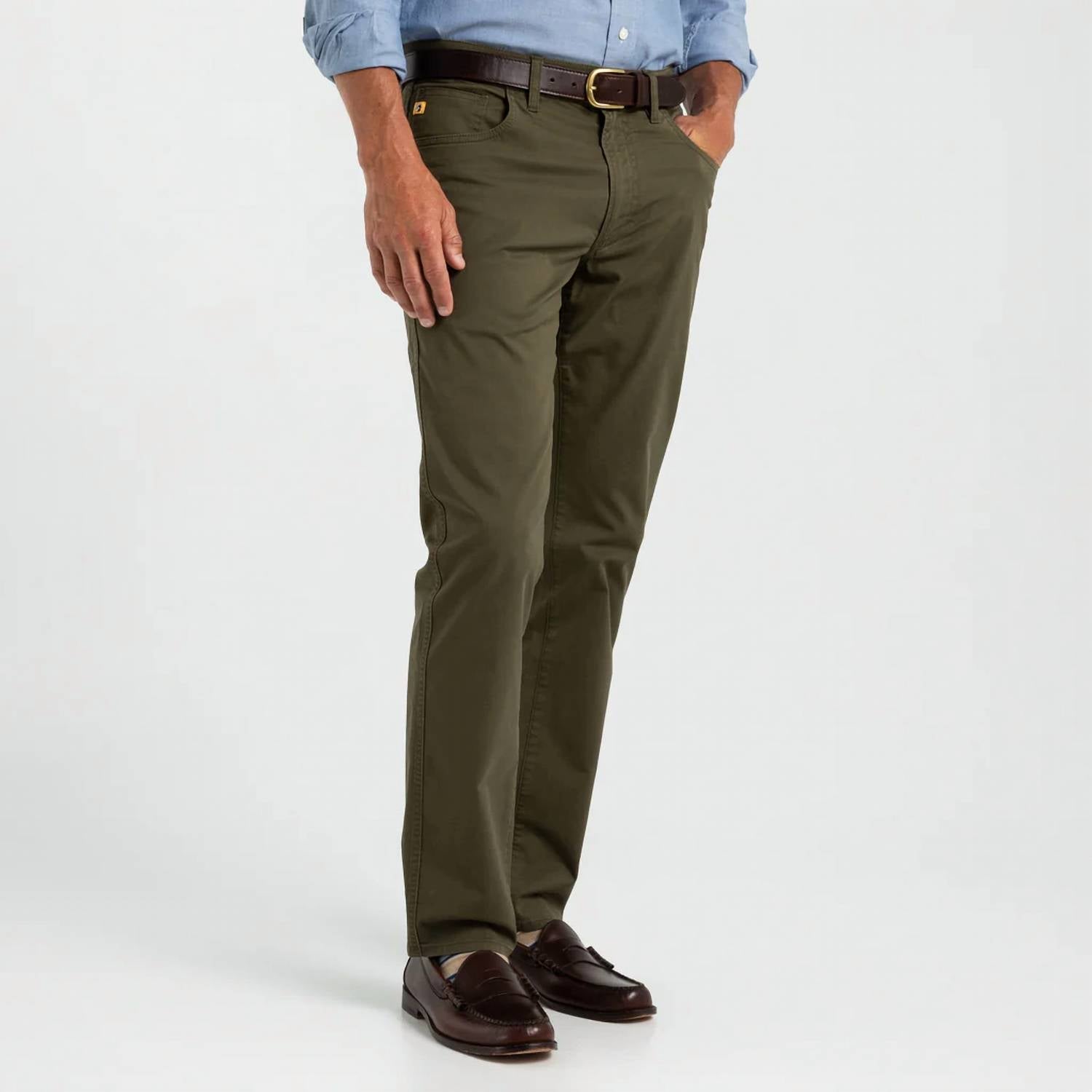 Upgrade your wardrobe with the Shoreline Five-pocket Pant by DUCK HEAD, tailored in a versatile Olive Pine shade. These solid-colored, straight-leg chinos are crafted from a breathable 97% cotton and 3% spandex blend, ensuring comfort with a touch of flexibility. The pants boast a flat-felled double-stitched seam and an iconic gold label on the coin pocket, complemented by the DH leather patch on the back. A reliable YKK zipper and logo metal shank button secure the zip closure, making these chinos ideal for any occasion. Care: Machine wash, tumble dry. 14 ¾” leg opening based on size 32/32.