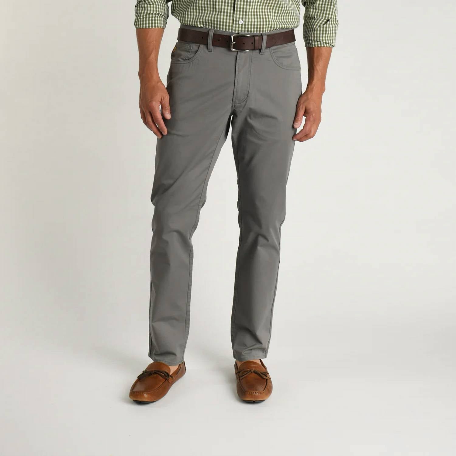 Introducing the Shoreline Twill 5 Pocket Pant by DUCK HEAD, a premium choice for men seeking comfort and style. Designed in a sleek steel grey, these straight-leg chinos feature a breathable 97% cotton and 3% spandex blend with a garment-washed finish for softness. They include signature details like the iconic gold label on the coin pocket and a DH leather patch. Closure: YKK zip closure with logo metal shank button. Care: Machine wash and tumble dry. Complete with a 14¾” leg opening based on size 32/32.