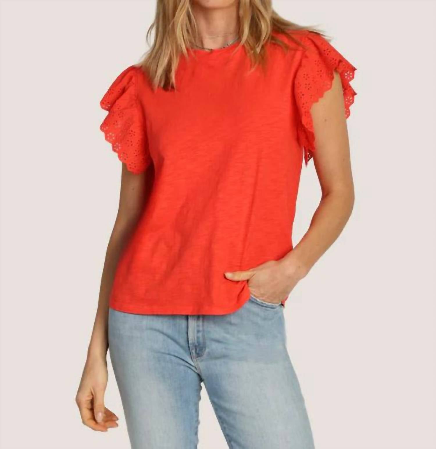 Introducing the Dylan Presley Short Sleeve Tee, a chic top in radiant poppy red that blends timeless style with a delicate twist. This women's crewneck tee is crafted from 100% cotton and features eyelet ruffle sleeves for added elegance. With a pull-on closure, it's perfect for summer dining or festive Easter gatherings, embodying minimalist trends. Easy care with machine wash and tumble dry, it's ideal for elevating casual ensembles.