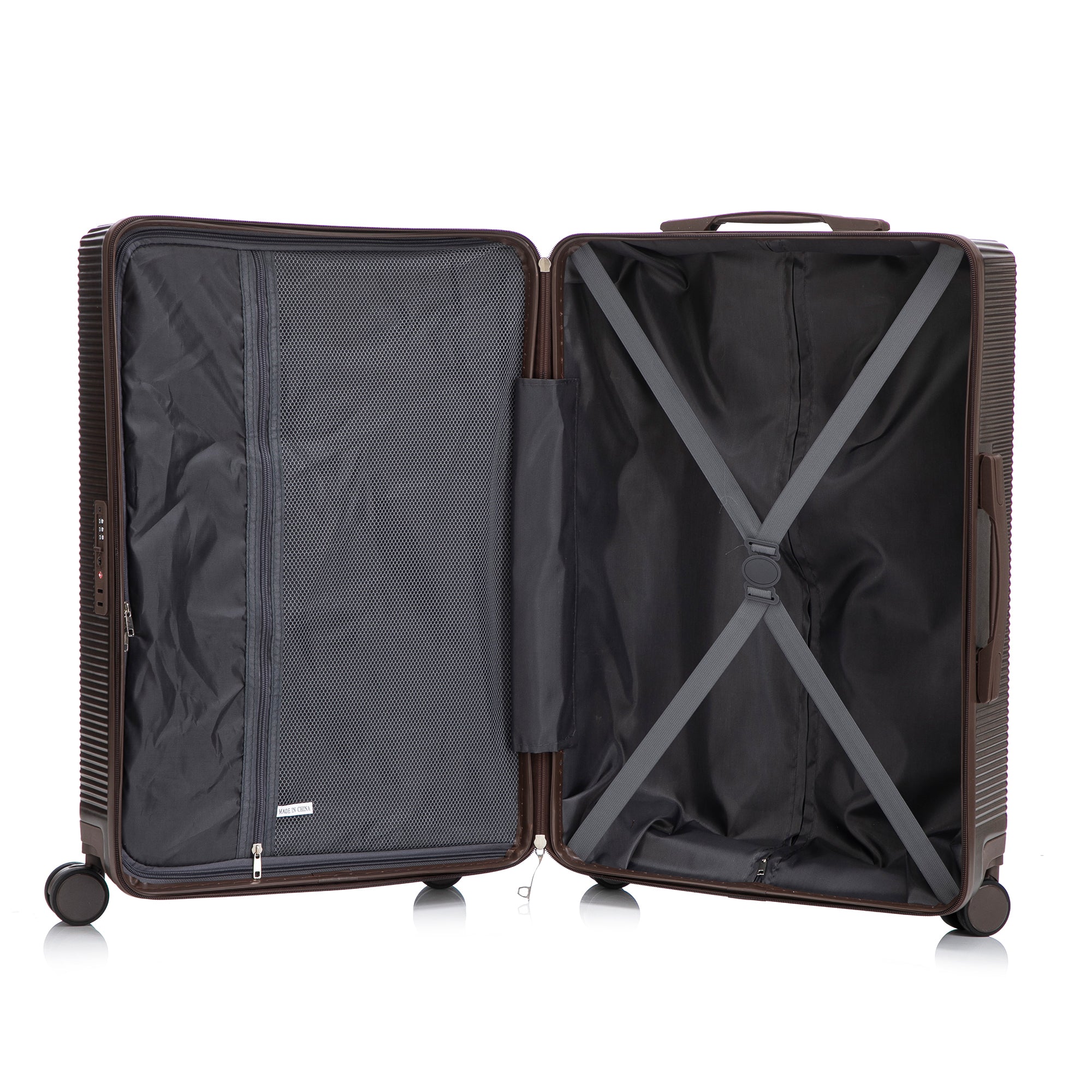 Each suitcase includes a fully lined interior with a zippered compartment, cross straps, and multiple storage layers to keep your belongings neatly organized. The low-profile top and side handles make lifting and carrying easy.