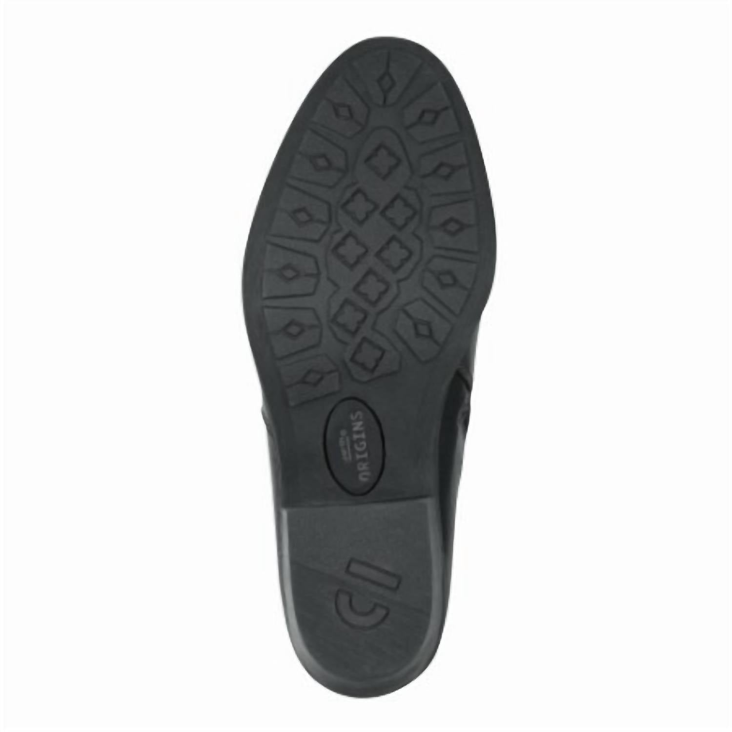 Step out in style with the Women's Christine Ankle Bootie by EARTH, crafted from premium black leather. This bootie showcases an almond toe and features artful patchwork that exquisitely cascades down the side, creating a stunning visual effect. A pull-on style makes it both effortless and chic, perfect for a variety of outfits. Whether you're dressing up or down, these booties ensure comfort and sophistication.
