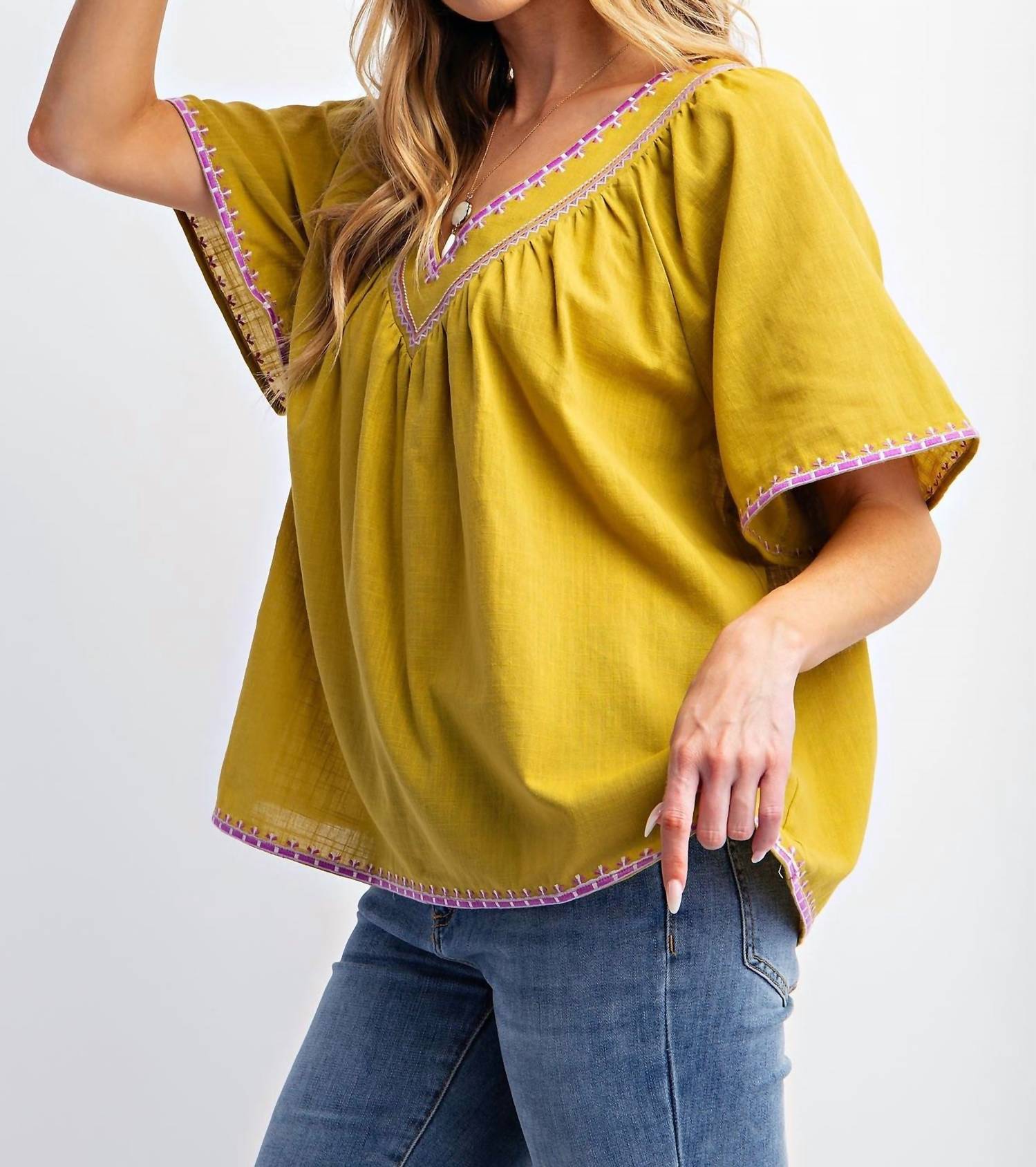 Pair this with your favorite jeans and slides for your next girls night out. Exquisite addition in a solid coral hue that's perfect for any holiday party. Features short wide sleeves and a flattering V-neckline, accentuated by elegant embroidery detailing. Made from luxurious cotton. Ruching and loose fit provide a relaxed yet effortlessly stylish look. Pull on style. Machine wash.