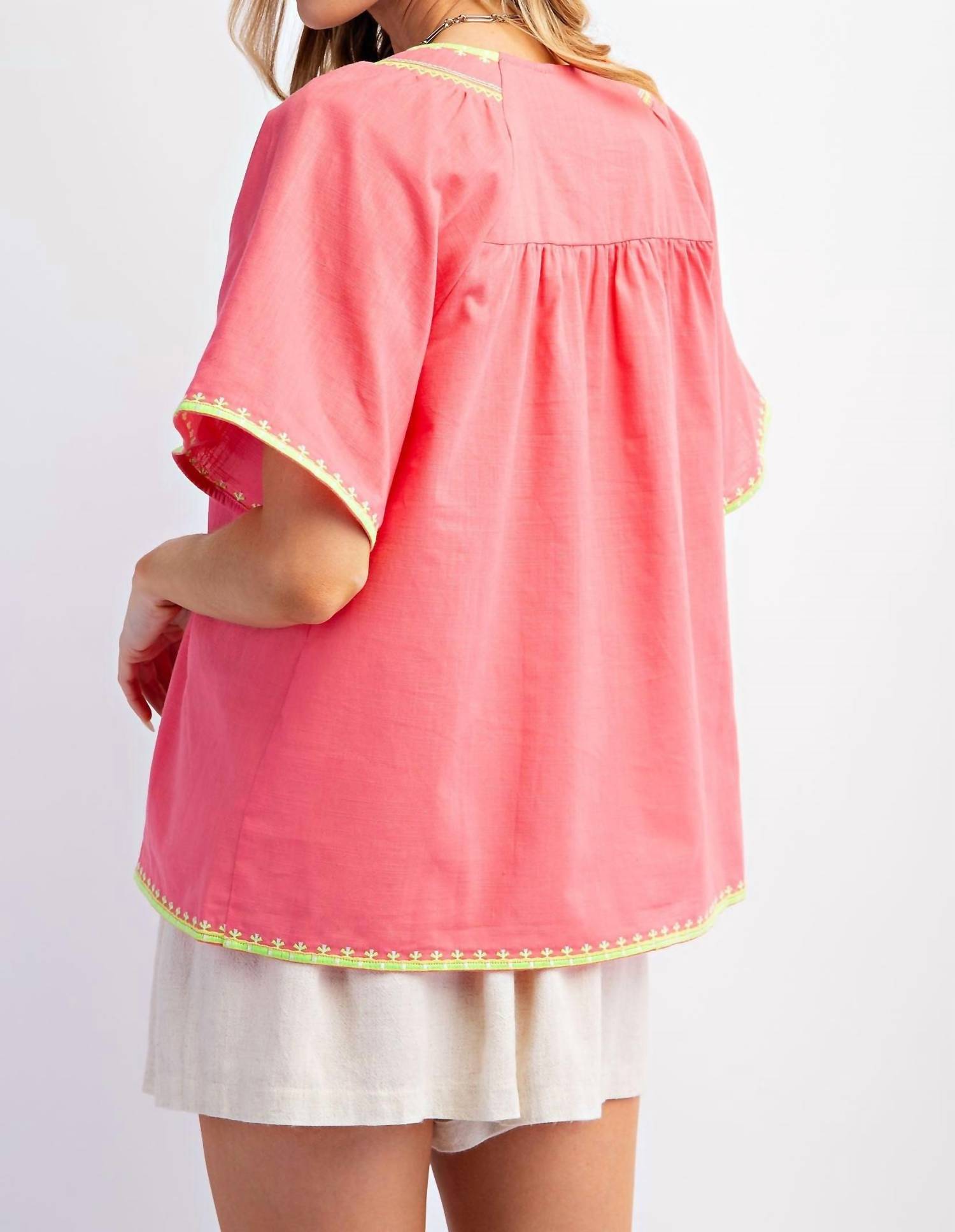 Pair this with your favorite jeans and slides for your next girls night out. Exquisite addition in a solid coral hue that's perfect for any holiday party. Features short wide sleeves and a flattering V-neckline, accentuated by elegant embroidery detailing. Made from luxurious cotton. Ruching and loose fit provide a relaxed yet effortlessly stylish look. Pull on style. Machine wash.