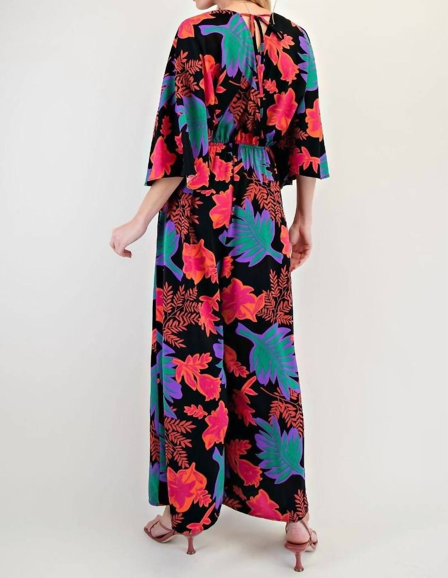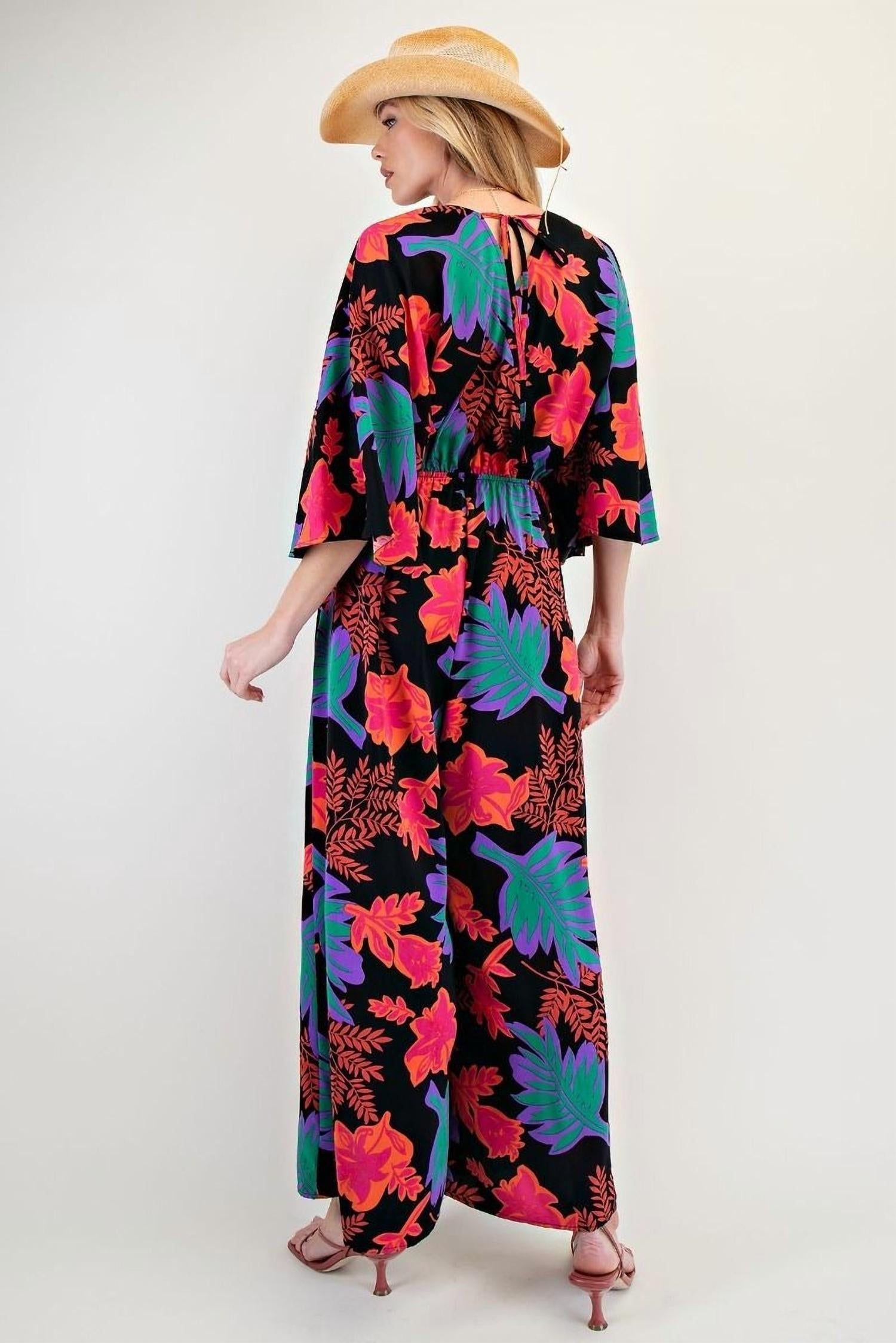 Throw it on and go! Elevate your vacation wardrobe with the Half Sleeves V Neck Printed Romper by Easel, a stunning multicolor piece perfect for spring adventures. Featuring short dolman sleeves, a V-neckline, and eye-catching leaf print detailing, this polyester romper offers a wide leg fit with a loose, relaxed silhouette. The elasticized waistband and convenient side pockets enhance comfort, while the drawstring back tie closure adds a playful touch. Care for this chic ensemble with ease by machine washing; ideal for effortless style on your next getaway.