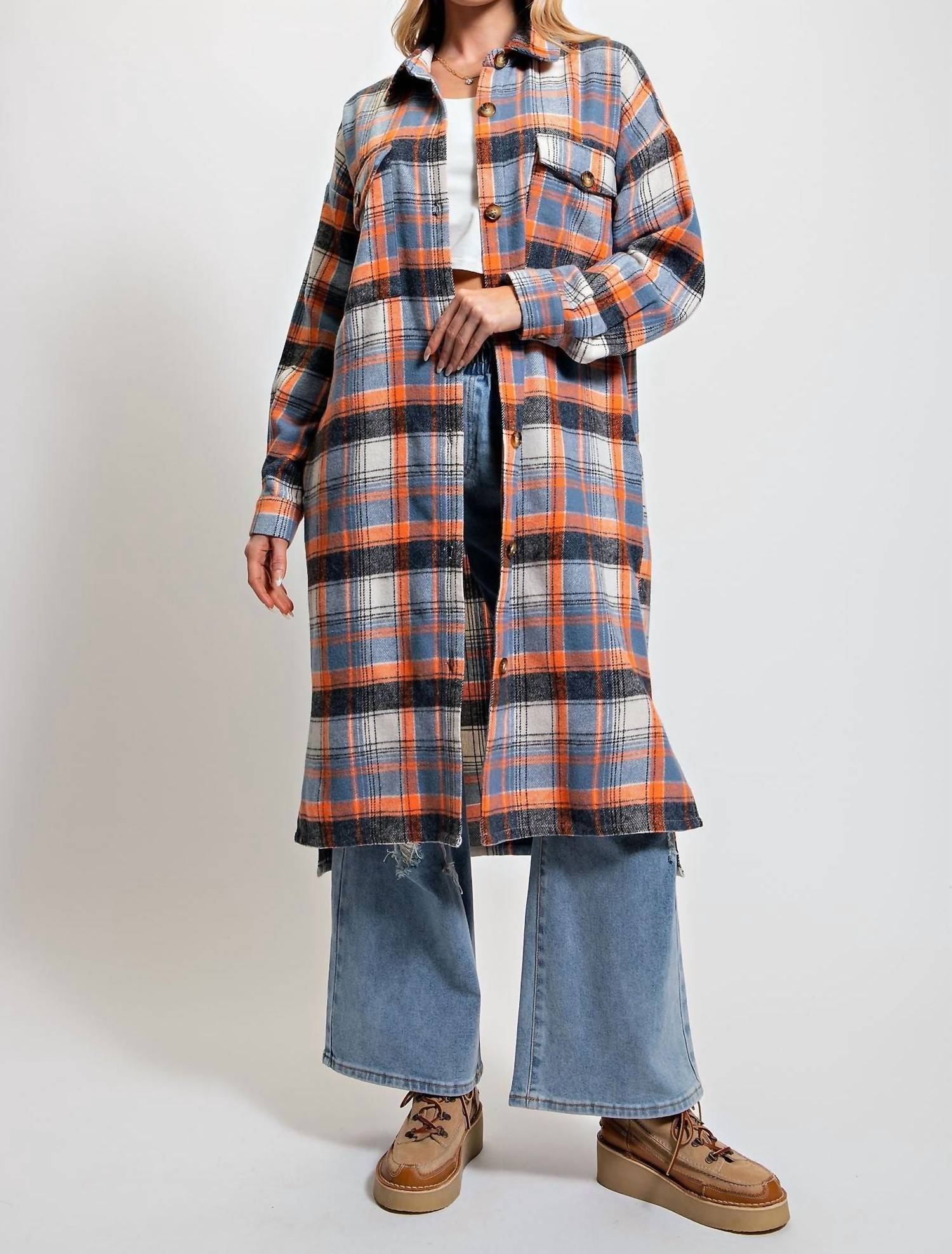A jacket so versatile you can literally wear it with anything. Embrace effortless style with the Plaid Button Down Jacket by Easel, an essential addition to any fall wardrobe. Crafted from 70% polyester and 30% cotton, this denim and orange jacket features long sleeves and a collared neckline, perfect for a relaxed and loose fit. With practical side and chest flap pockets plus side slits, it combines functionality and fashion seamlessly. Closure: Button closure. Care: Machine wash, tumble dry. Ideal for game day or Thanksgiving celebrations.