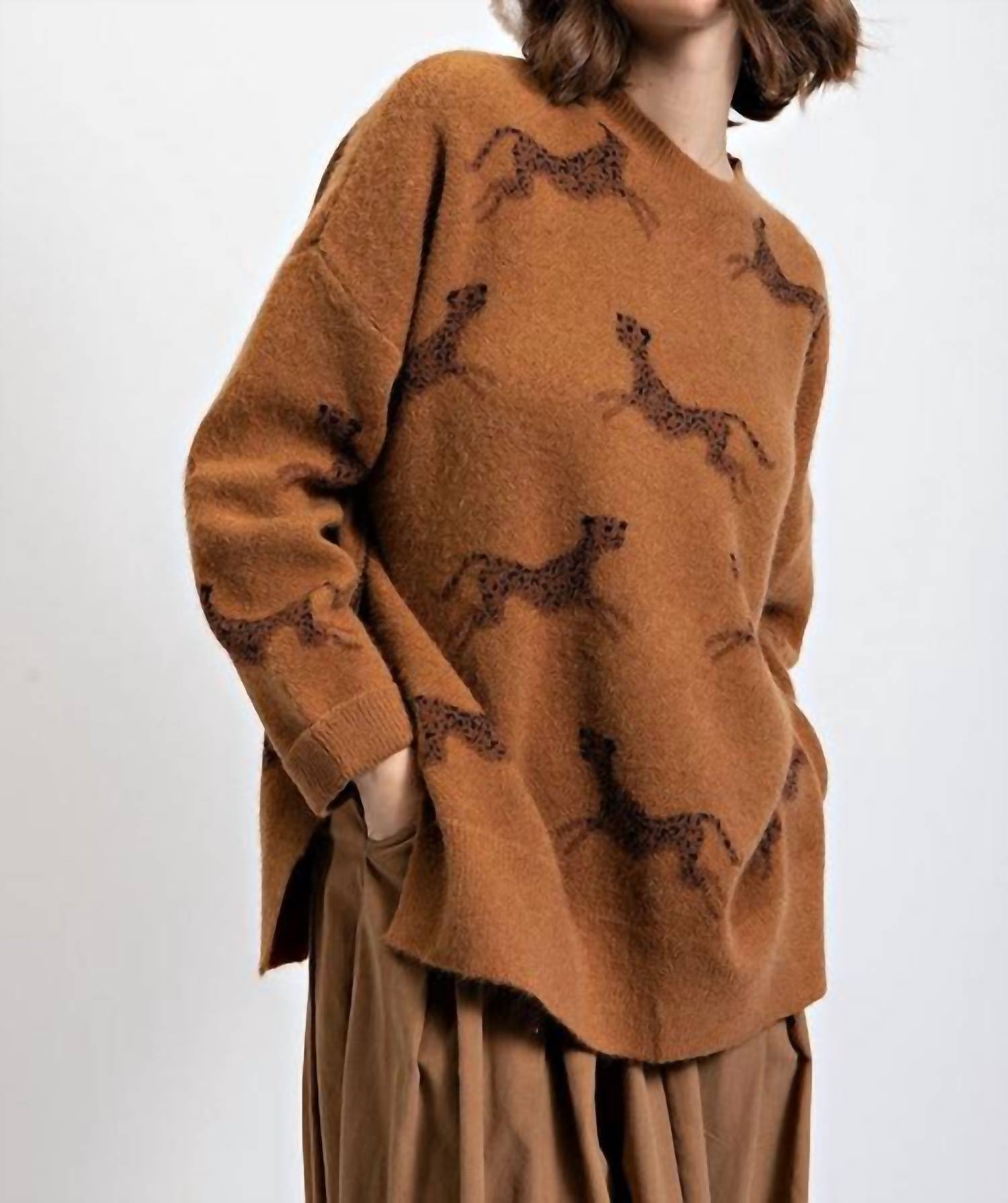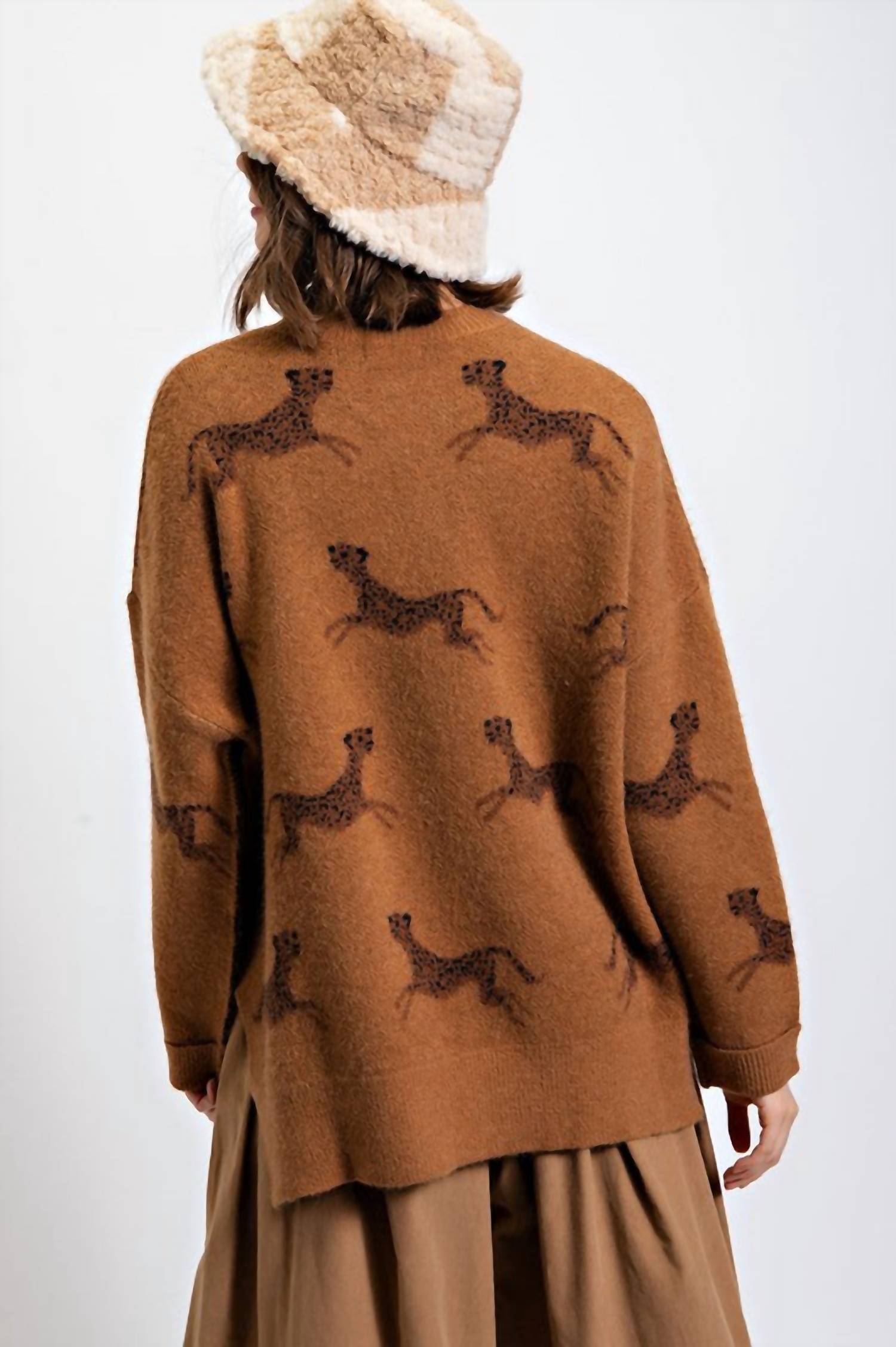 Stay warm and stylish in this versatile and effortlessly cool knitwear staple. Wear it alone or layered, it's the perfect sweater for the season and you'll wish you had it in every color. Embrace the elegance of the Easel Round Neck Drop Shoulder Cheetah Printed Sweater, designed with a chic graphic pattern perfect for fall. The long sleeves and drop shoulder design enhance the relaxed fit, providing comfort and style for any travel occasion or Thanksgiving gathering. Composition: 52% Acrylic, 28% Nylon, 20% Polyester. Closure: Pull on. Care: Machine wash. Ideal for minimalist lovers seeking a trendy addition to their plus-size wardrobe in a rich brown hue.