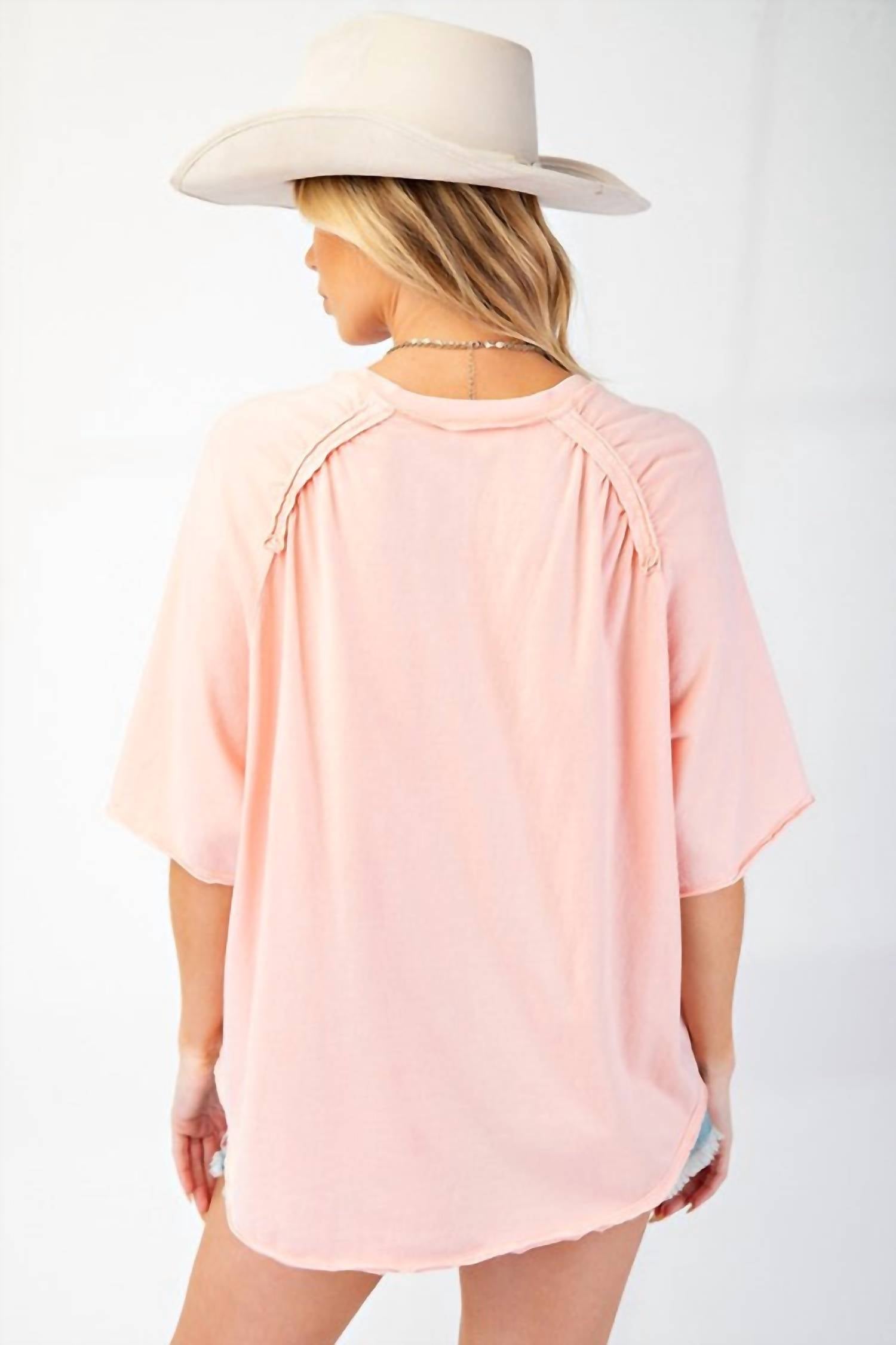 The short sleeve tee you'll want in every color. Elevate your summer wardrobe with the Short Sleeve Jersey Top by Easel, perfect for vacation-ready outfits in a refreshing peach hue. This relaxed tee features short sleeves and a crewneck, complemented by ruched back detailing and a rounded raw cut hem for a minimalist aesthetic. Crafted from soft cotton, it offers a loose and comfortable fit with a length of 27.5 inches and a bust of 25 inches. Made for ease, it sports a pull-on closure and requires simple care: machine wash and tumble dry.