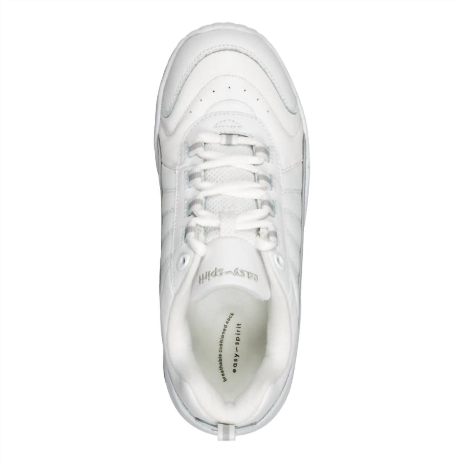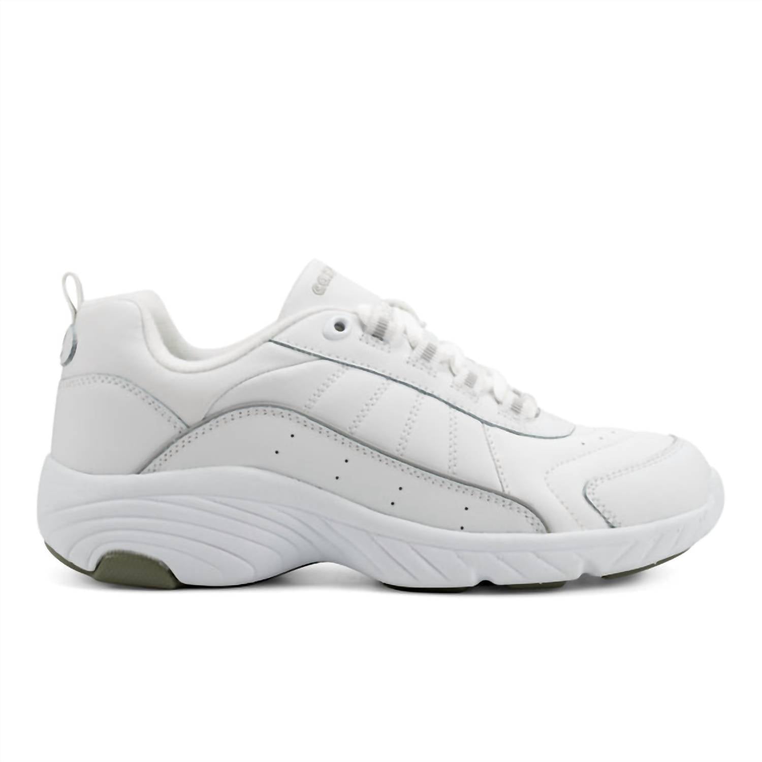 Experience ultimate comfort and style with the Women's Punter Athletic Shoes by Easy Spirit, available in White/Light Grey. These shoes feature a leather upper with perforated details for breathability and a super padded collar for support. Designed with a 1.77" heel and a round toe, they boast a foam-padded shock-absorbing midsole and ultra-soft fabric linings. Closure is achieved with a full lace-up style, and the outsole is crafted from durable rubber.