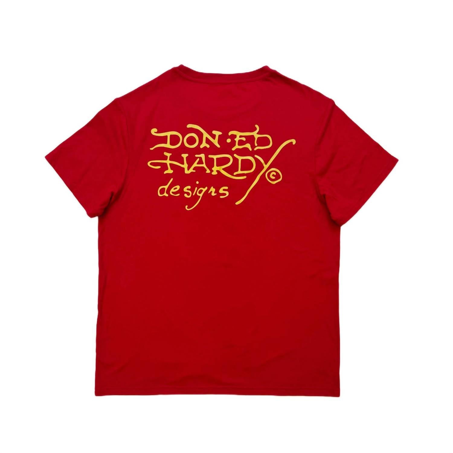 Experience the Ed Hardy Live Fast Tee in vibrant red, designed to make a statement with tattoo-inspired printed graphics and short sleeves. This cotton T-shirt ensures all-day comfort with its lightweight and breathable material. Featuring a ribbed crewneck collar, it offers a classic fit ideal for any streetwear enthusiast. Closure: Pull on. Perfect for making an impression at a holiday party or any casual spring outing.
