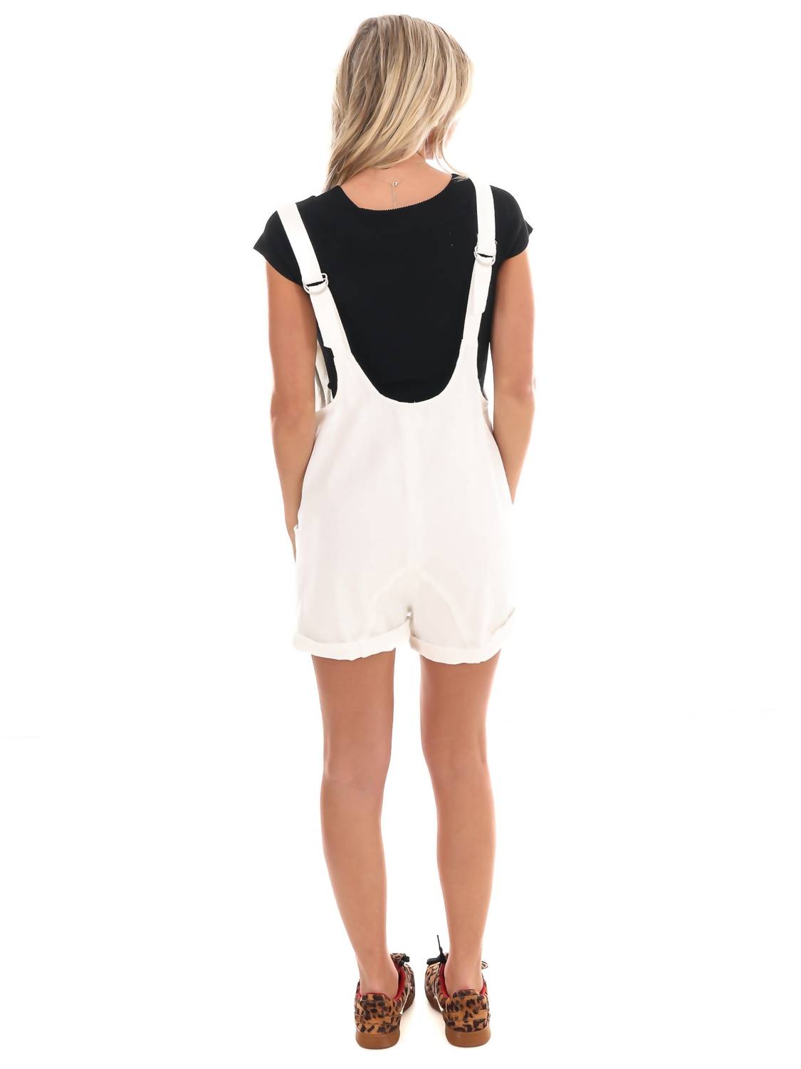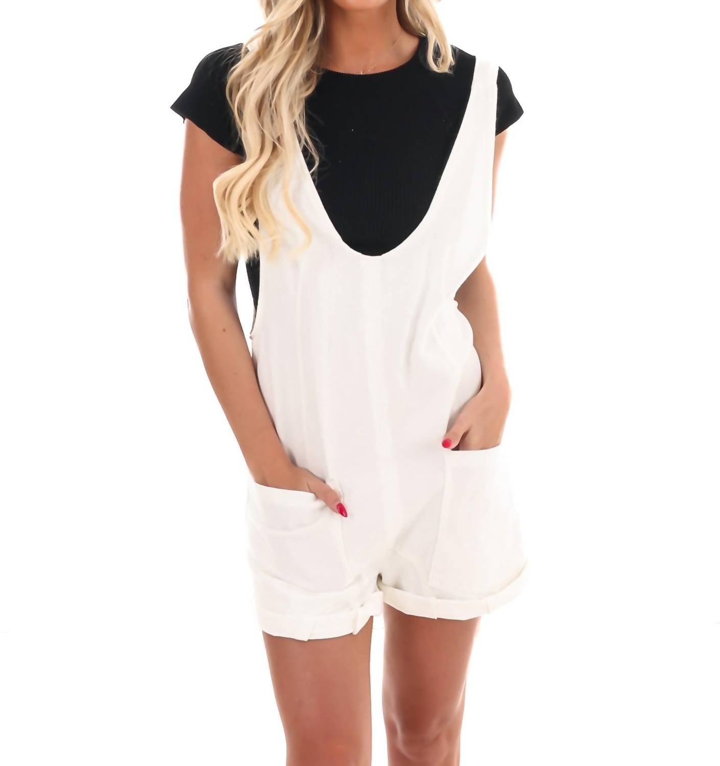 Elevate your summer style with the Destined For More Sleeveless Denim Romper by ee:some, crafted from 100% soft Rayon material for a chic, off-white look. This solid piece features a playful sleeveless design and convenient pockets, making it perfect for any occasion, especially summer holiday parties. Closure: Pull On. Care: Machine wash, tumble dry.