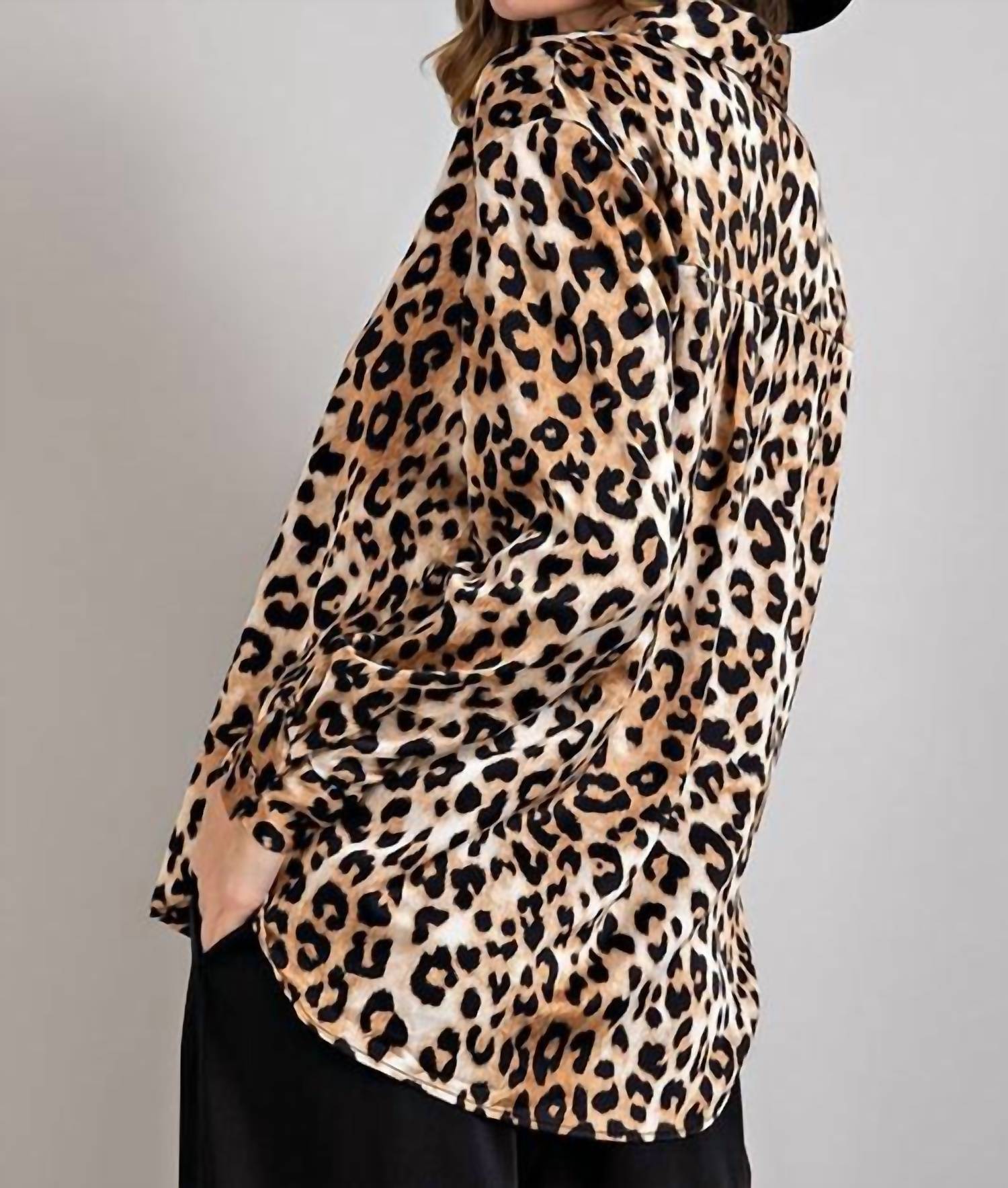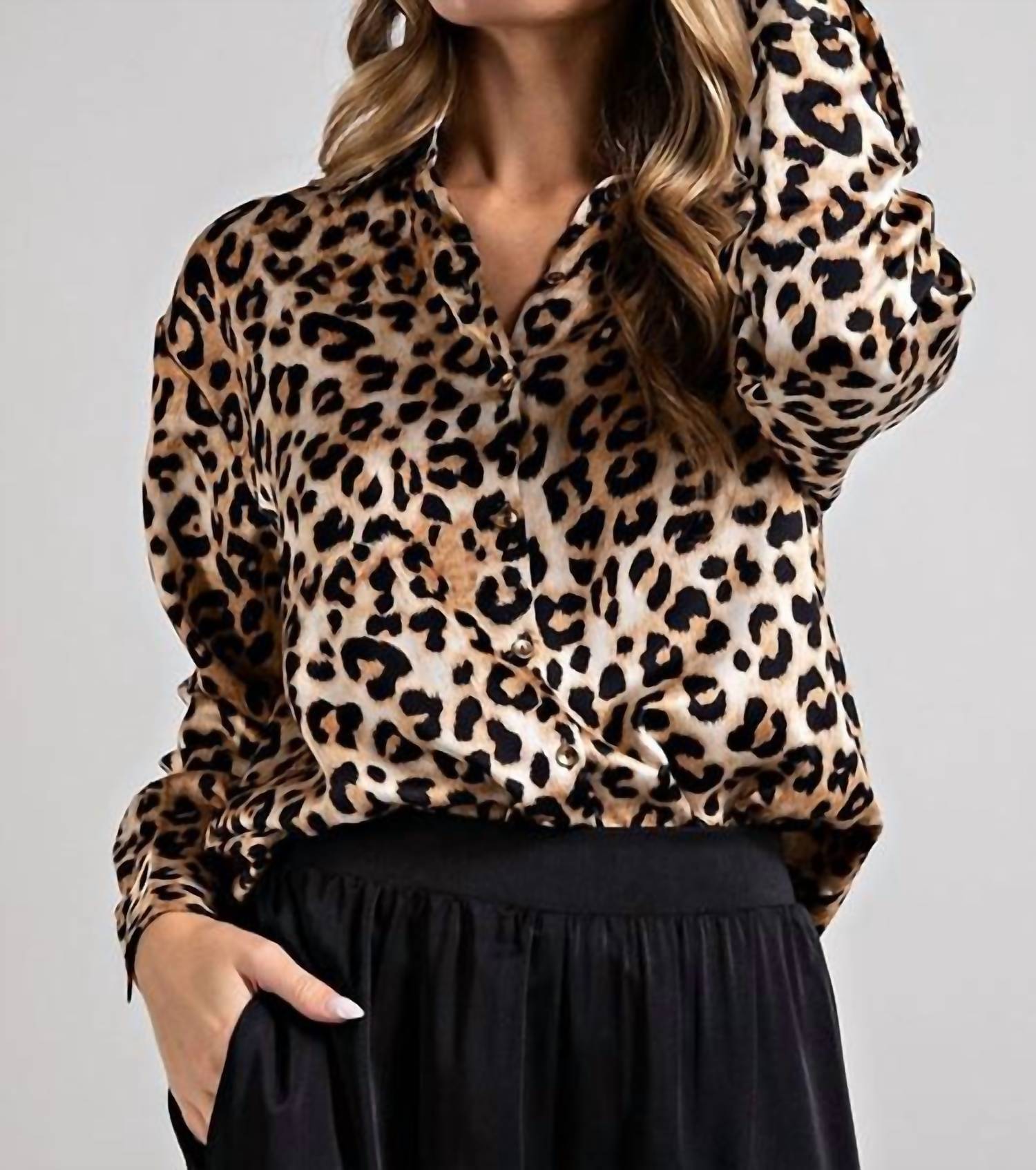 Introducing the Leopard Print Button Up Blouse by ee:some, a bold addition to your streetwear wardrobe. This women's blouse in a striking animal pattern features long sleeves and a flattering V-neckline, perfect for a Thanksgiving dinner party. Material: Polyester. Closure: Button closure. Care: Hand wash and line dry.