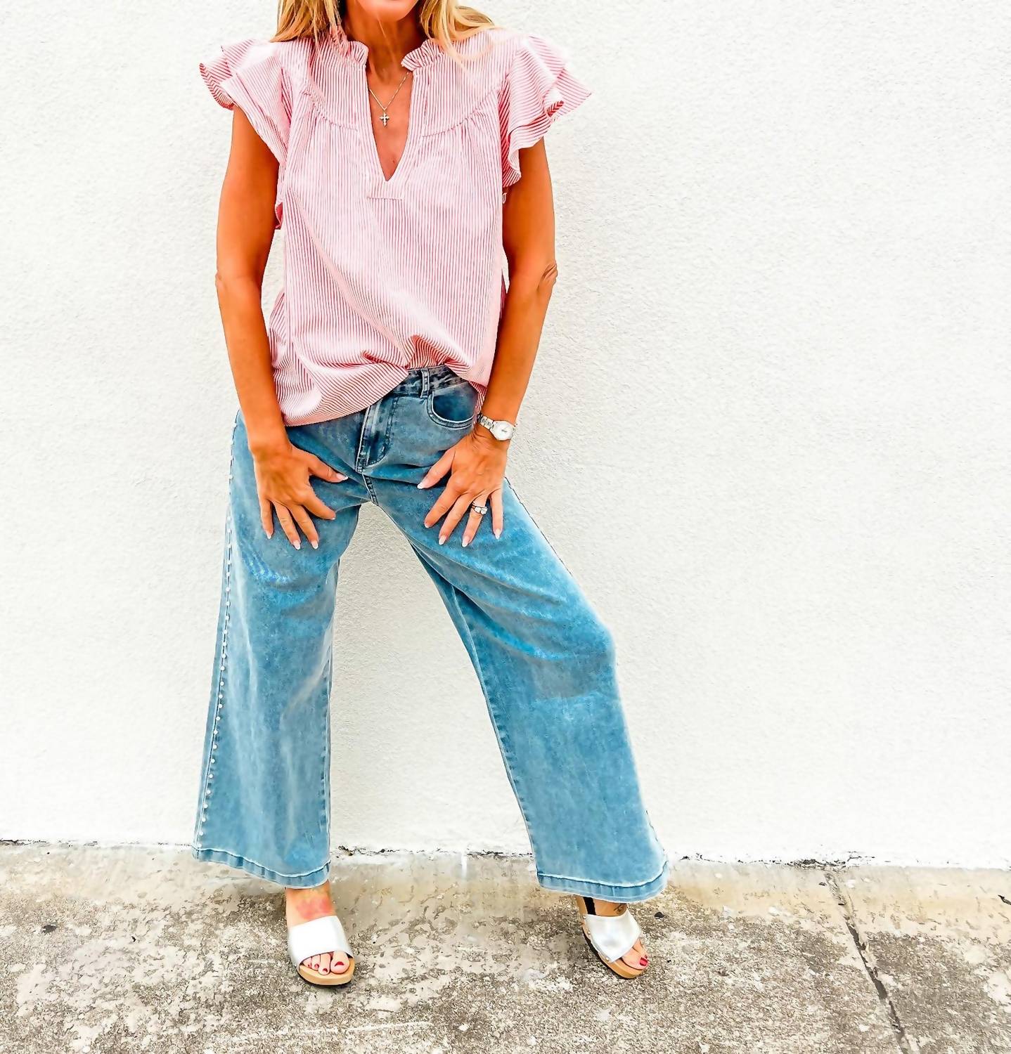 Elevate your everyday style with the Sass & Stripes Ruffle Top by ee:some, crafted from 100% breathable cotton in a vibrant tomato red stripe. This blouse features short, double-layered flutter sleeves and a ruffle-trimmed notched V-neckline for an instant charm. Its relaxed fit is complemented by subtle back pinching, adding an extra touch of femininity. Care instructions: Machine wash. Ideal for effortlessly stylish sunny days.