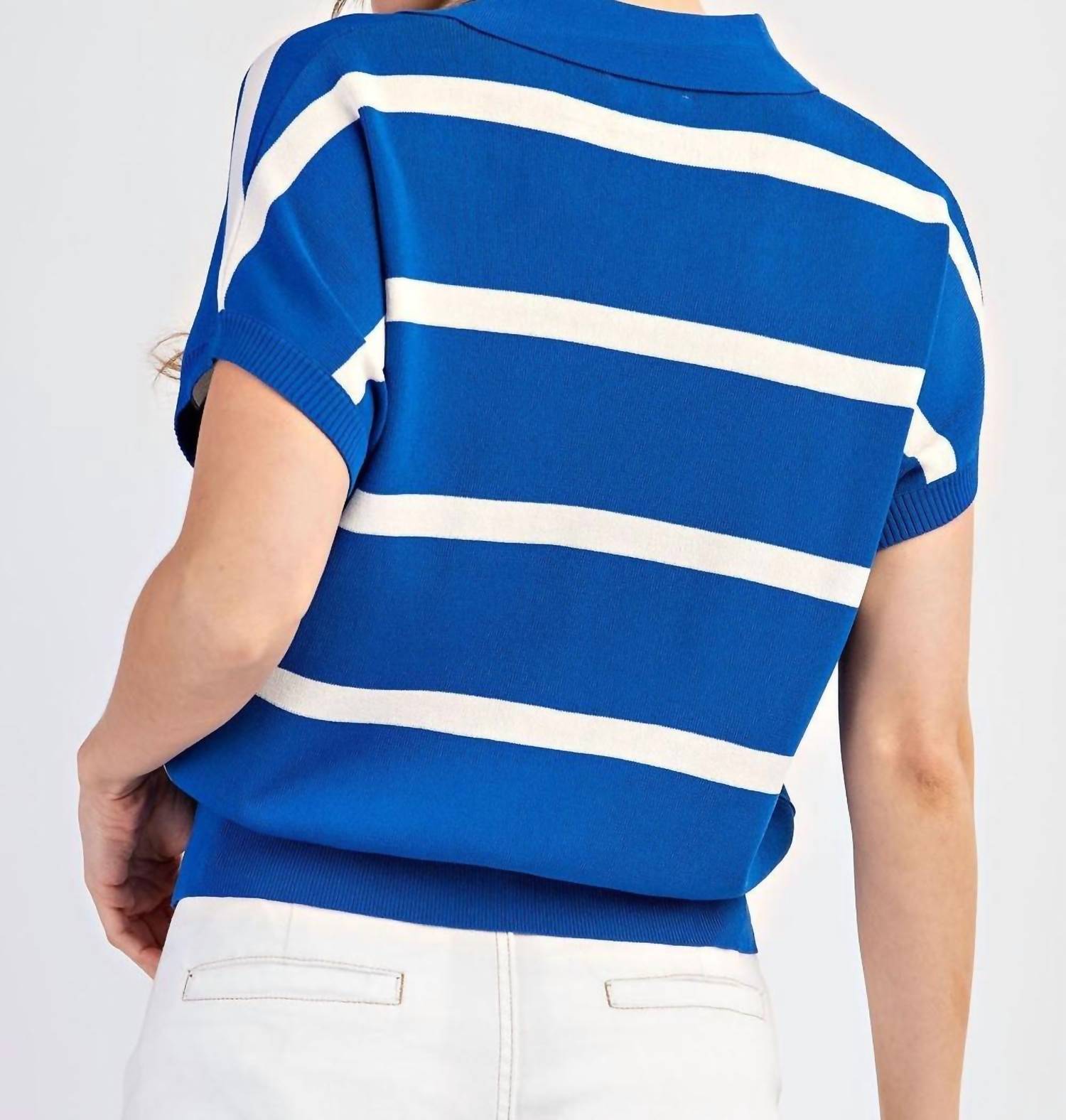 This classic, short sleeve tee will be your go-to staple this season and beyond. Boost your wardrobe with the Say Please Top by ee:some, available in chic blue stripes, perfect for a 90s-inspired look. This short sleeve tee features a collared split neckline and offers an oversized, relaxed fit. Crafted from a blend of 63% viscose and 37% nylon, the top ensures comfort and style, and it is convenient for machine washing. Closure: Pull-on design. The bust measurements are Small (40"), Medium (42"), and Large (44").