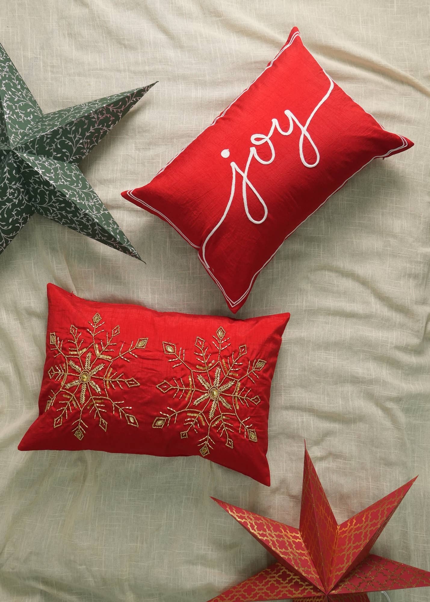 Add a festive touch to your home with this 24x16" red holiday lumbar pillow, featuring an elegantly embroidered ‘Joy’ design. Crafted from premium polyester blend with a soft polyester filling, it combines comfort, durability, and holiday charm—perfect for sofas, armchairs, entryway benches, or beds.