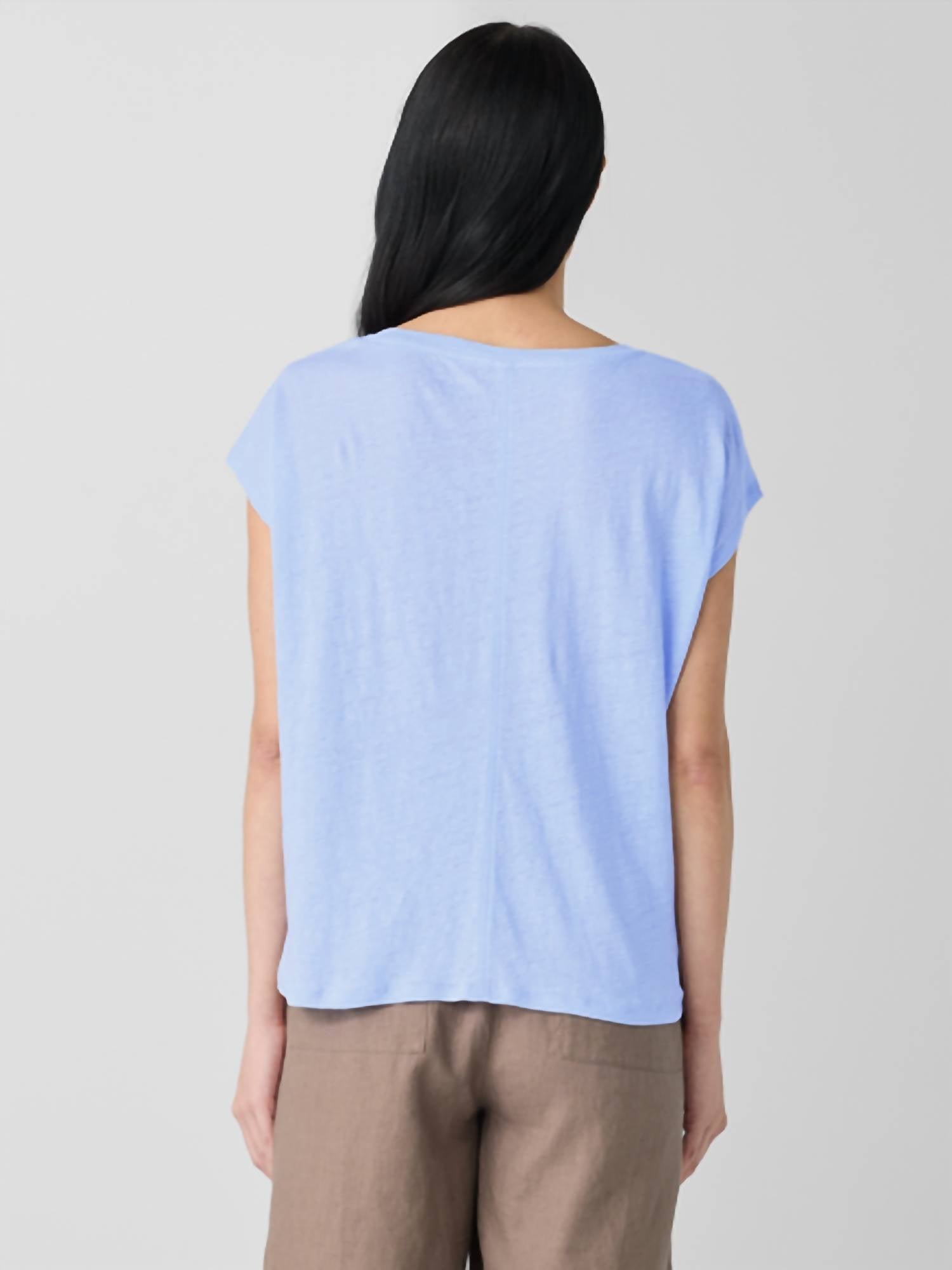 The short sleeve tee you'll want in every color. An everyday essential—the V-neck tee with cap sleeves. In our signature Organic Linen Jersey, lightweight with subtle texture. Made in a Fair Trade Certified™ factory. A generous, boxy fit that drapes away from the body to create movement. V-neck, cap sleeves, center front seam and center back seam. Finished with banding at the neck.