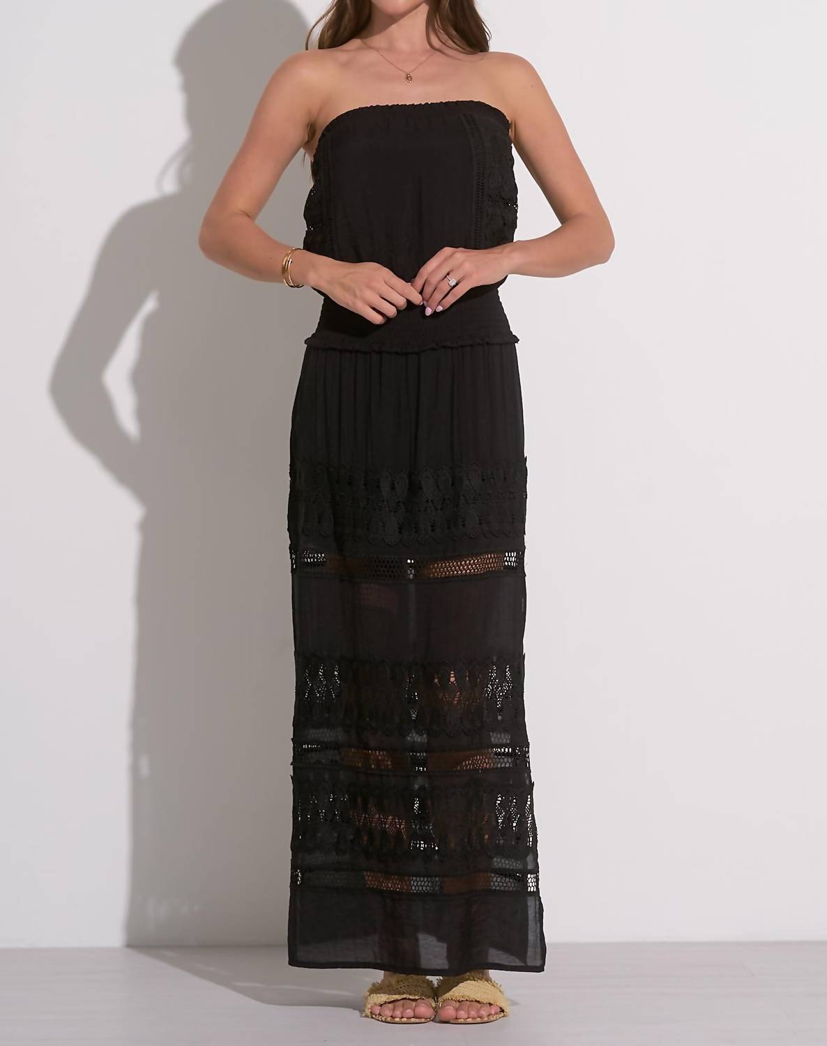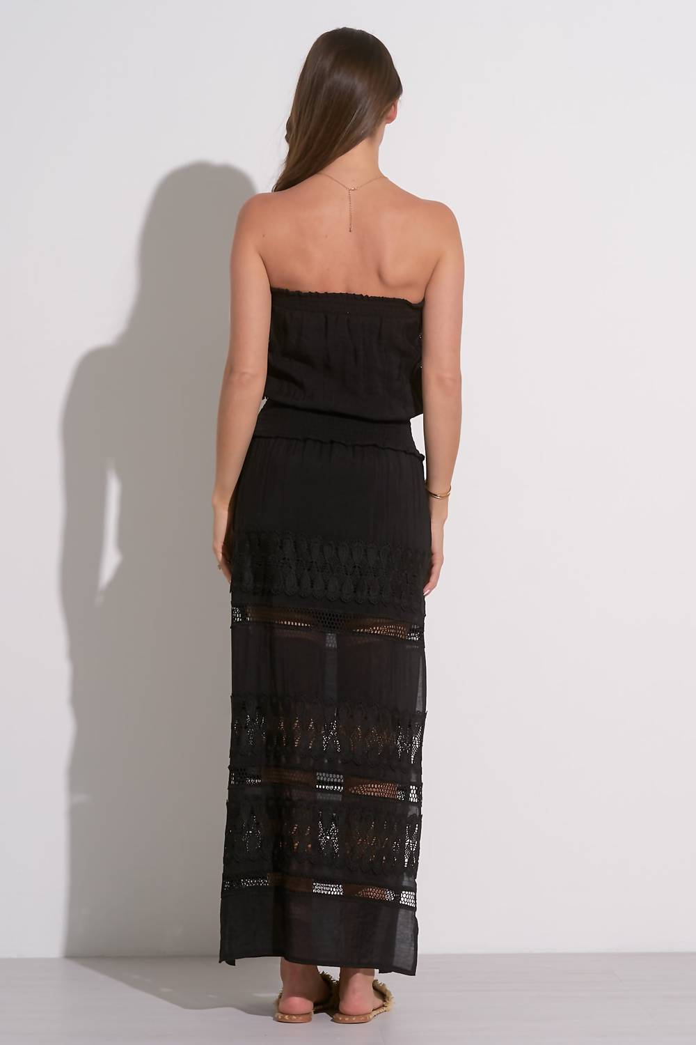 A maxi dress that is just as cute as it is comfortable. Introducing the Athena Strapless Maxi Dress by ELAN, a striking blend of bohemian charm and modern elegance. This strapless dress in versatile black features intricate crochet paneling and a flattering A-line silhouette. Crafted from a viscose blend for a textured finish, it offers pull-on styling for comfort and ease. Composition: 50% Viscose, 30% Polyester, 20% Polyamide. Care: Dry clean only. Perfect for summer days or dinner parties, this piece will be your go-to for warm-weather elegance.
